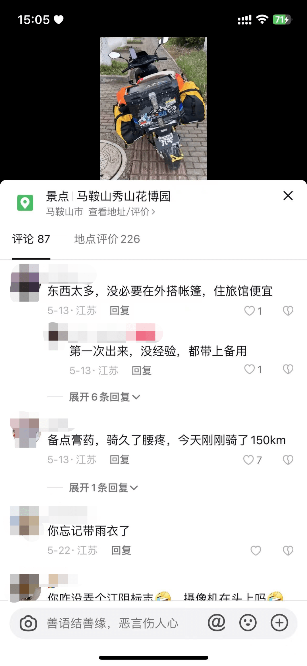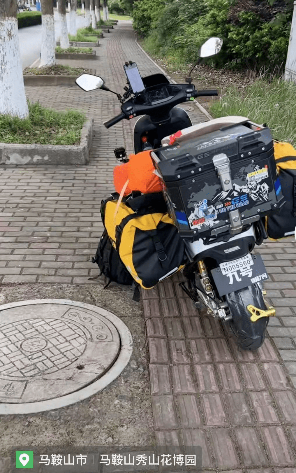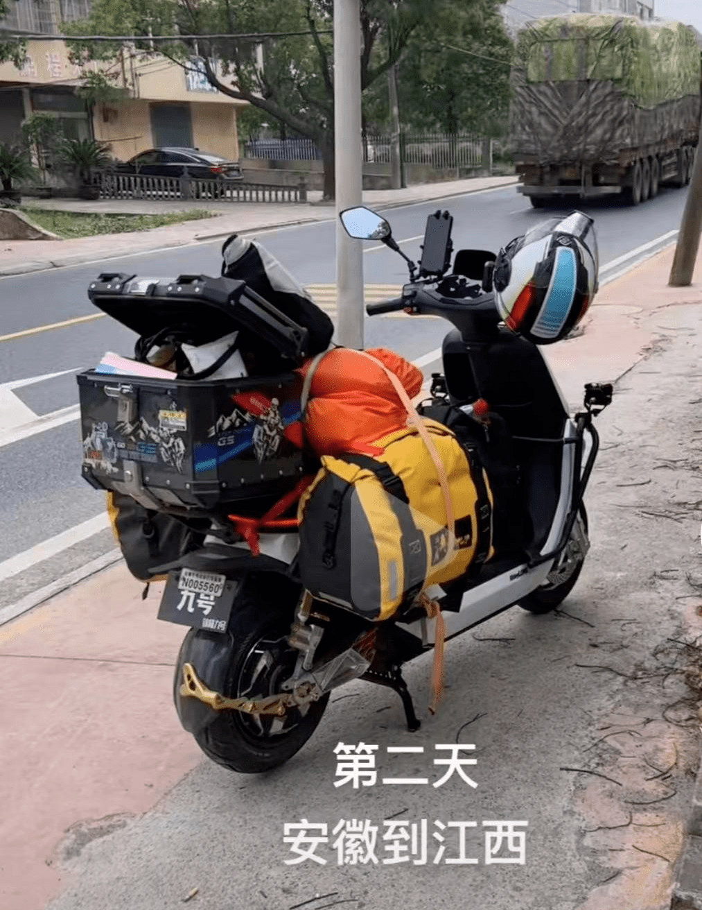庄明召的电动车上,光是物资就载重一百多斤,主要包括充电设备,衣服和食物。第一天,他一口气骑了两百多公里,到达安徽省马鞍山市。