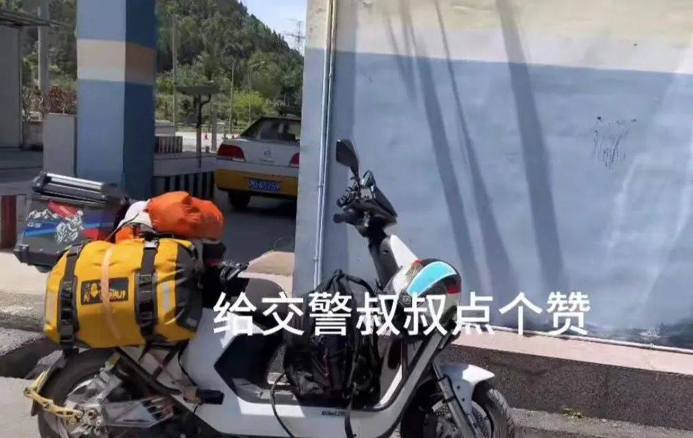 面临着前不着村后不着店、无法继续骑行的尴尬情况,庄明召焦急万分,当他经过当地检查站时,交警与庄明召简单交谈之后,同意他在这里充电,一下子解决了他的燃眉之急。