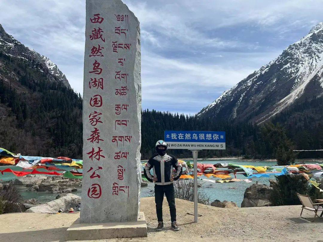 他在然乌湖国家森林公园,碧绿的湖泊边留下身影。