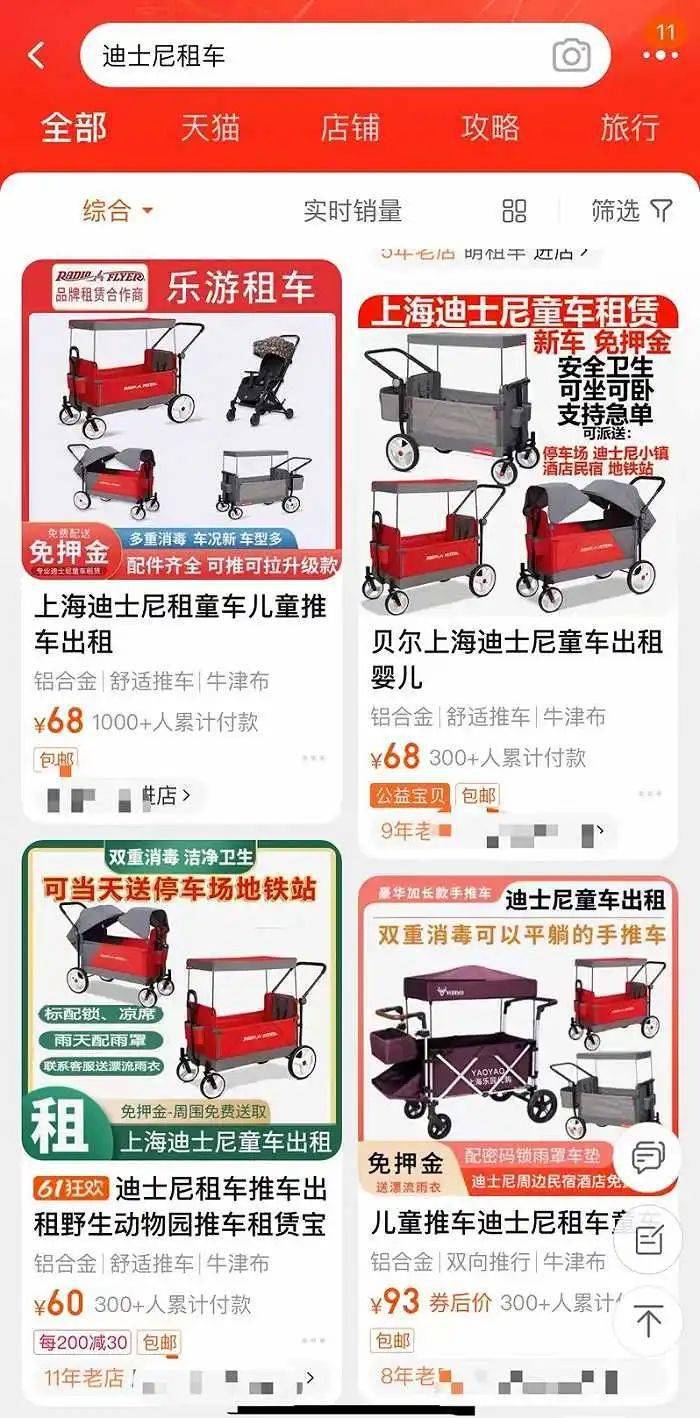 在上海迪士尼和北京环球影城,不少人发现了租赁野营车的商机。在电商平台上搜索迪士尼租车,可以找到大量商家在出租野营车,根据型号不同租金在100-200元一天。