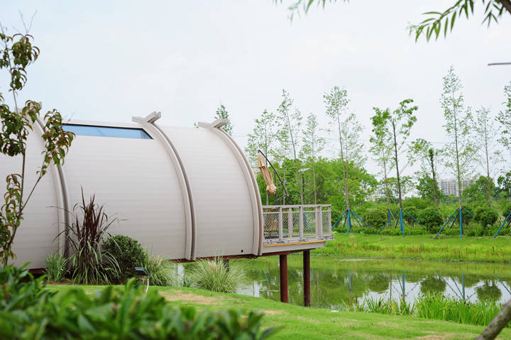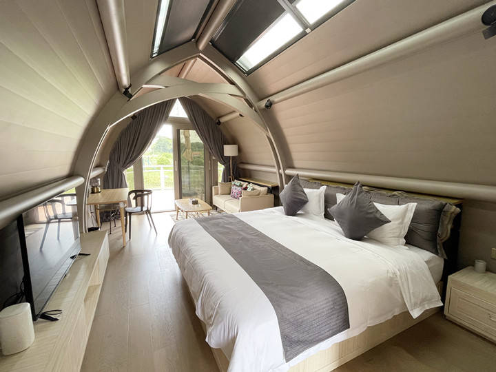 隐匿于碧水田园间的亲水船屋,每间船屋外配有私密的小庭院,船屋内配有亲水露台。闲坐藤质座椅,看鱼跃池塘,五彩莲池,荷花挺水,飞鸟翔集;夜晚躺平在柔软的床铺上,天水共色,梦枕星河。
