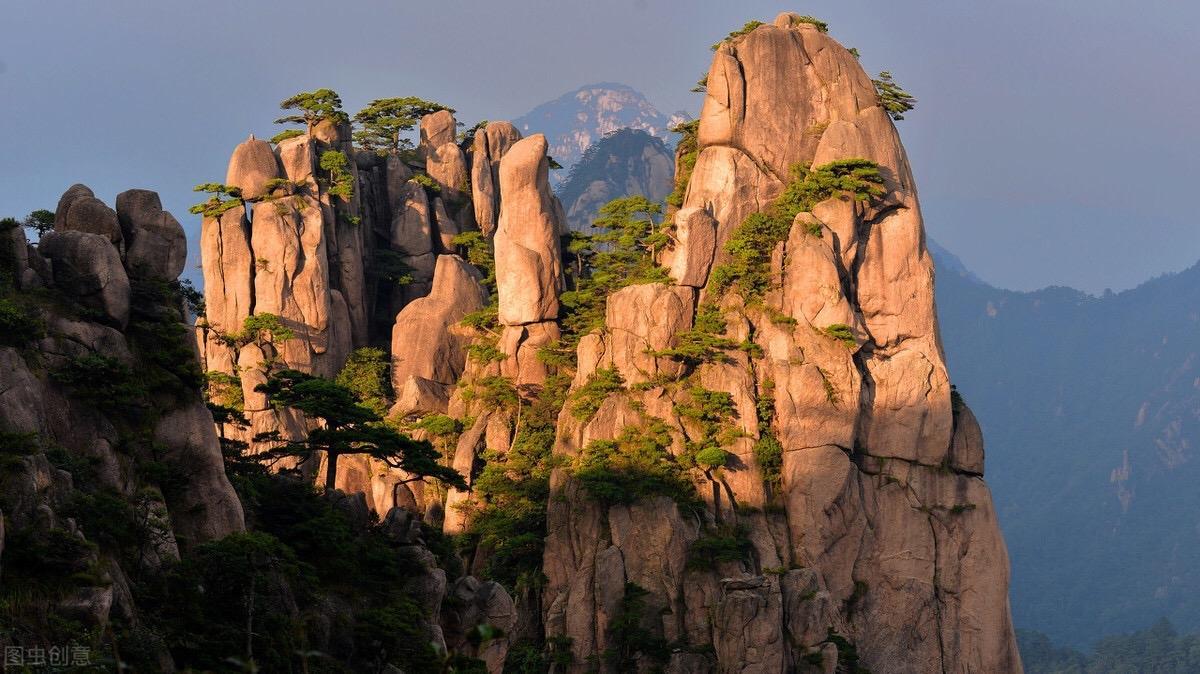 3、春天的黄山:红叶漫山,日出、云海、晚霞、星空交相辉映,构成一幅色彩斑斓的油画。