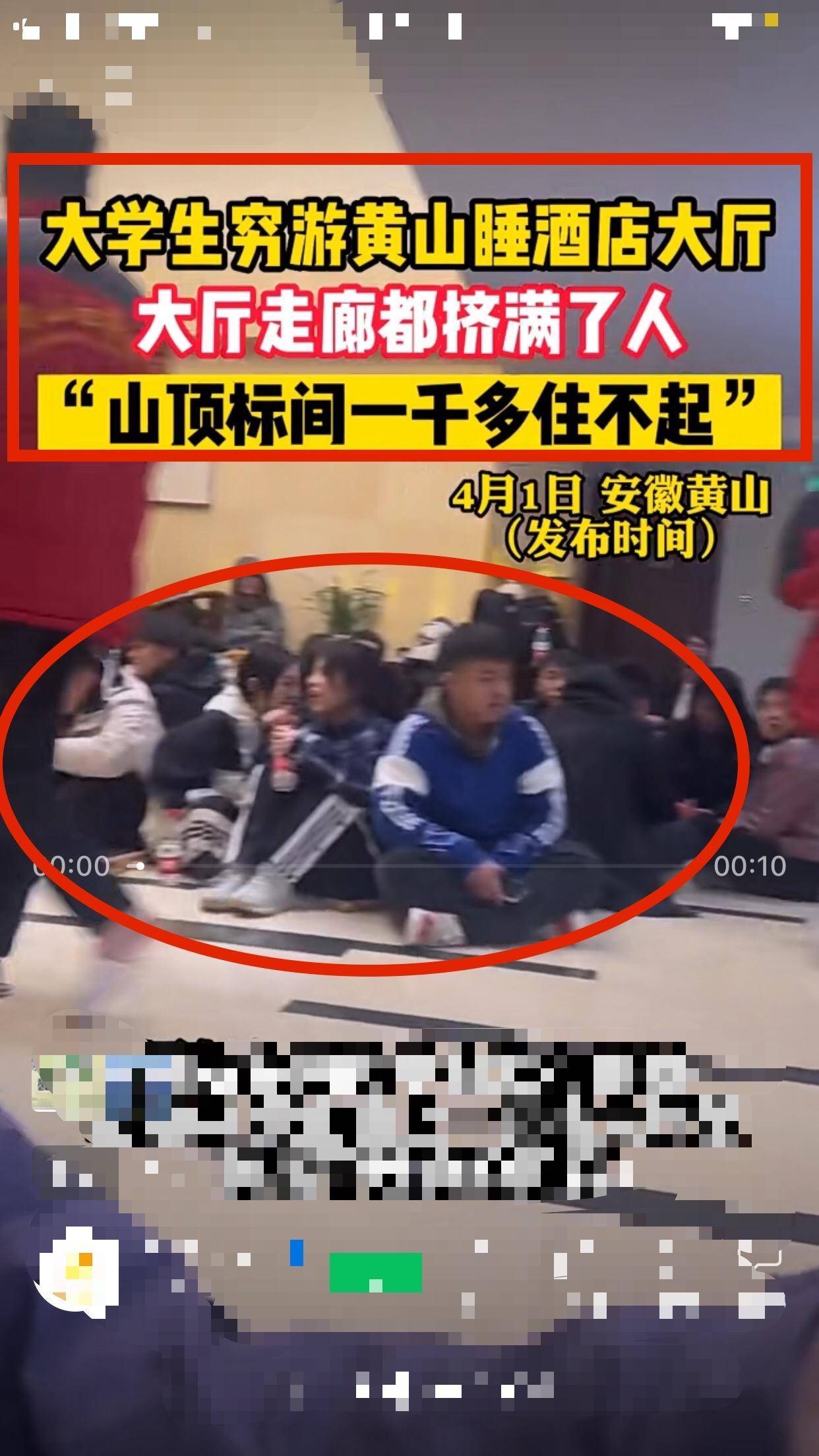 然而,四月初一,学生们接手了黄山风景区。据媒体报道:4月1日,安徽省黄山山顶的一家酒店大堂挤满了过夜的游客。大多数游客都是贫困学生。标间一晚要1000多元。对于学生来说,这是一个天文数字。(那是住标准间一个月的生活费。)住不起酒店,只能租酒店大堂休息。酒店大堂和走廊人头攒动。挤满了人。