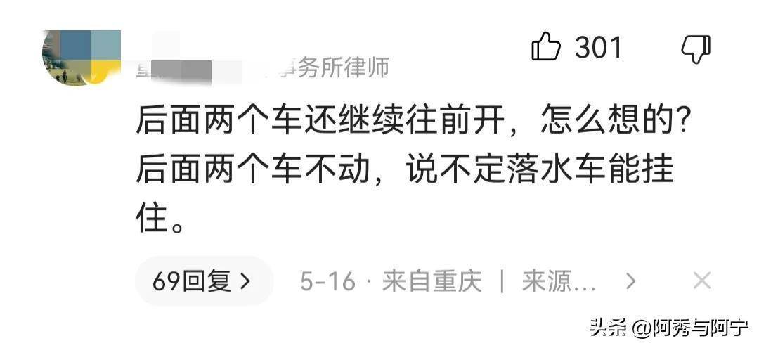 有网友分析视频认为,雨天路面湿滑、操作不当,导致车辆漂移、侧滑、坠湖,应由商务车司机承担主要责任。
