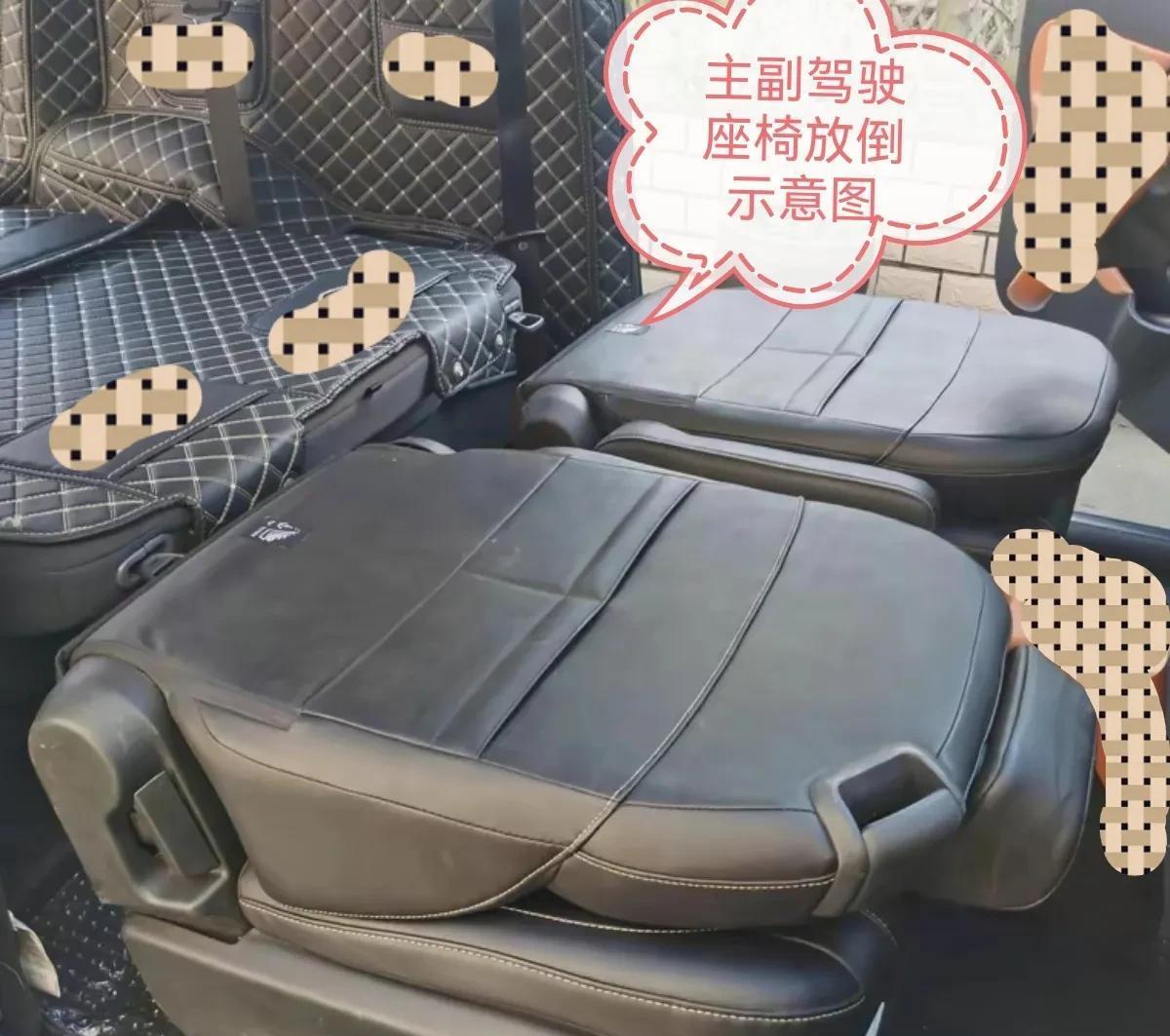 通过驾驶副驾驶座椅折叠放平可以放下一张1.2×2米的大床,床下为大小不一的储物格,长的可以放下1.6米长的钓鱼用具。水箱、便携式坐便器等也是放在床下。