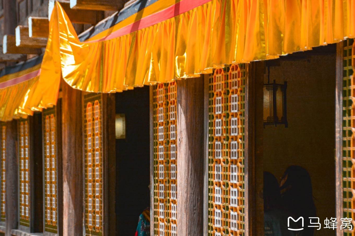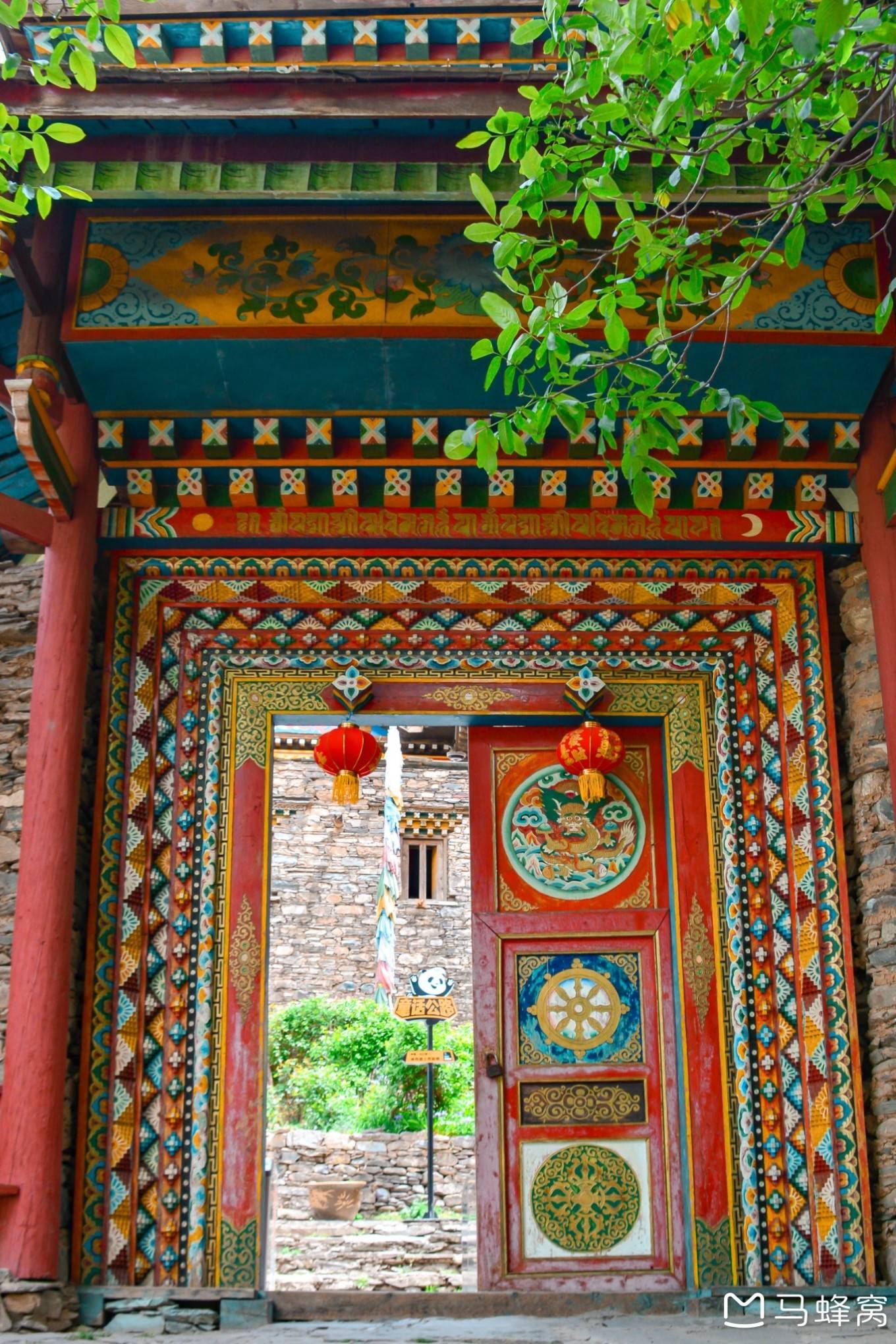 顺着公路边的石梯而上,便是卓克基那装饰着五彩图案的木门,透过敞开一半门的缝隙往里看,石头砌成的建筑出现在了眼前。