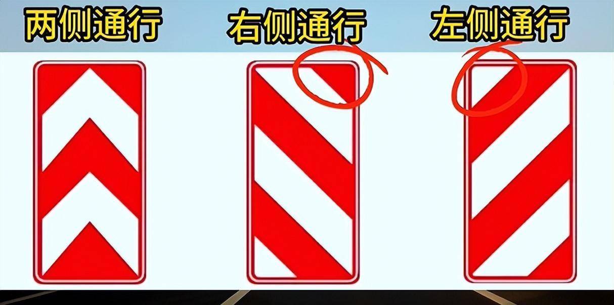第八组、这三个出现的时候,很多人都会懵,第一个还好,两侧通行很好识别。第二个和第三个很多人都会搞错,其实很简单,只需看顶部的三角指向,中间这个的三角指向在右边,指向的也是右边,那就是右侧通行。第三个的三角指向在左边,指向的也是左边,那就是左侧通行。