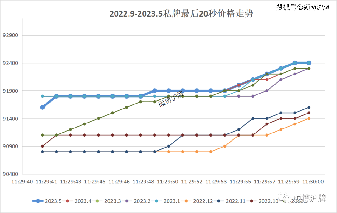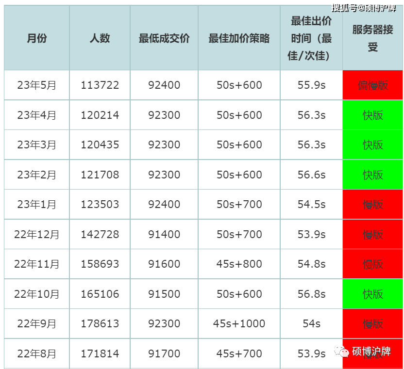 最近几个月沪牌价格走势均呈现一定程度的断层,也即前期不跳价,后程发力,尤其是最后5秒跳价较快。相信这一规律将不会持续下去,就像真理永远只掌握在少数人手里一样,沪牌每个月也只有小部分人能中标。