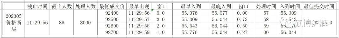 5月跳价规律和之前有一些变化,11:29:42-11:29:48不跳价,11:29:49-11:29:54不跳价,没有出现严格意义的大断层,最后成交价是92400-92700,最佳策略仍为50+500-700。不同的是提交时间,4月份及之前三个月,均为56s以后的时间,俗称快版,5月份的提交时间提前到55.3s附近,为慢版,虽然没有很慢,但进度条卡顿程度情况比前三个月明显好了很多。