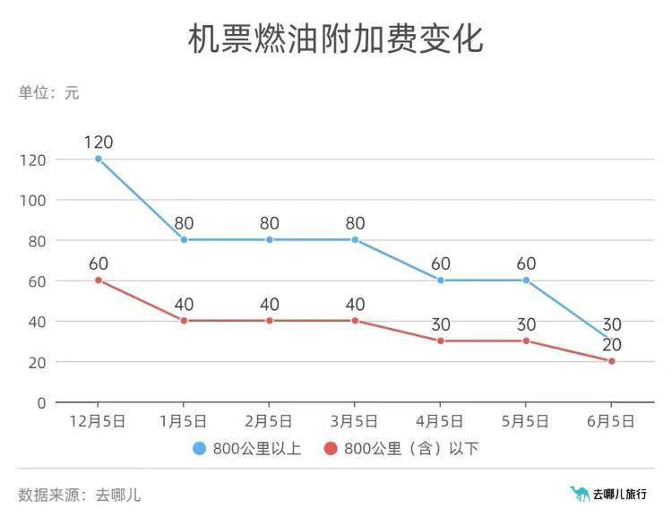 据了解,此次下调机票燃油附加费后,800公里及以下航段,成年旅客燃油附加费由此前的30元降至20元,800公里以上航段燃油附加费收取标准由60元降至30元。也就是说,800公里以下和800公里以上航段,分别下降了33.33%和50%。