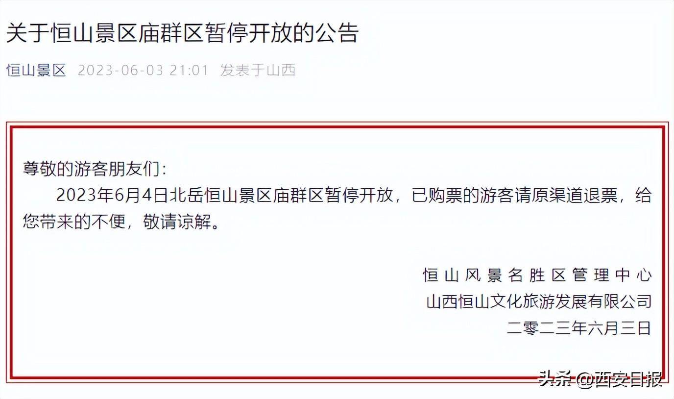 6月3日,恒山景区发布公告称,6月4日北岳恒山景区庙群区暂停开放,已购票的游客请原渠道退票。