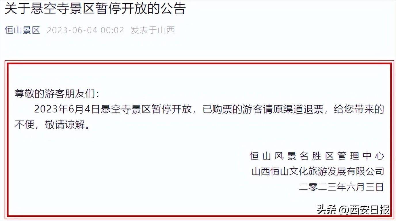 6月4日凌晨,恒山景区发布公告,当天悬空寺景区暂停开放,已购票的游客请原渠道退票。