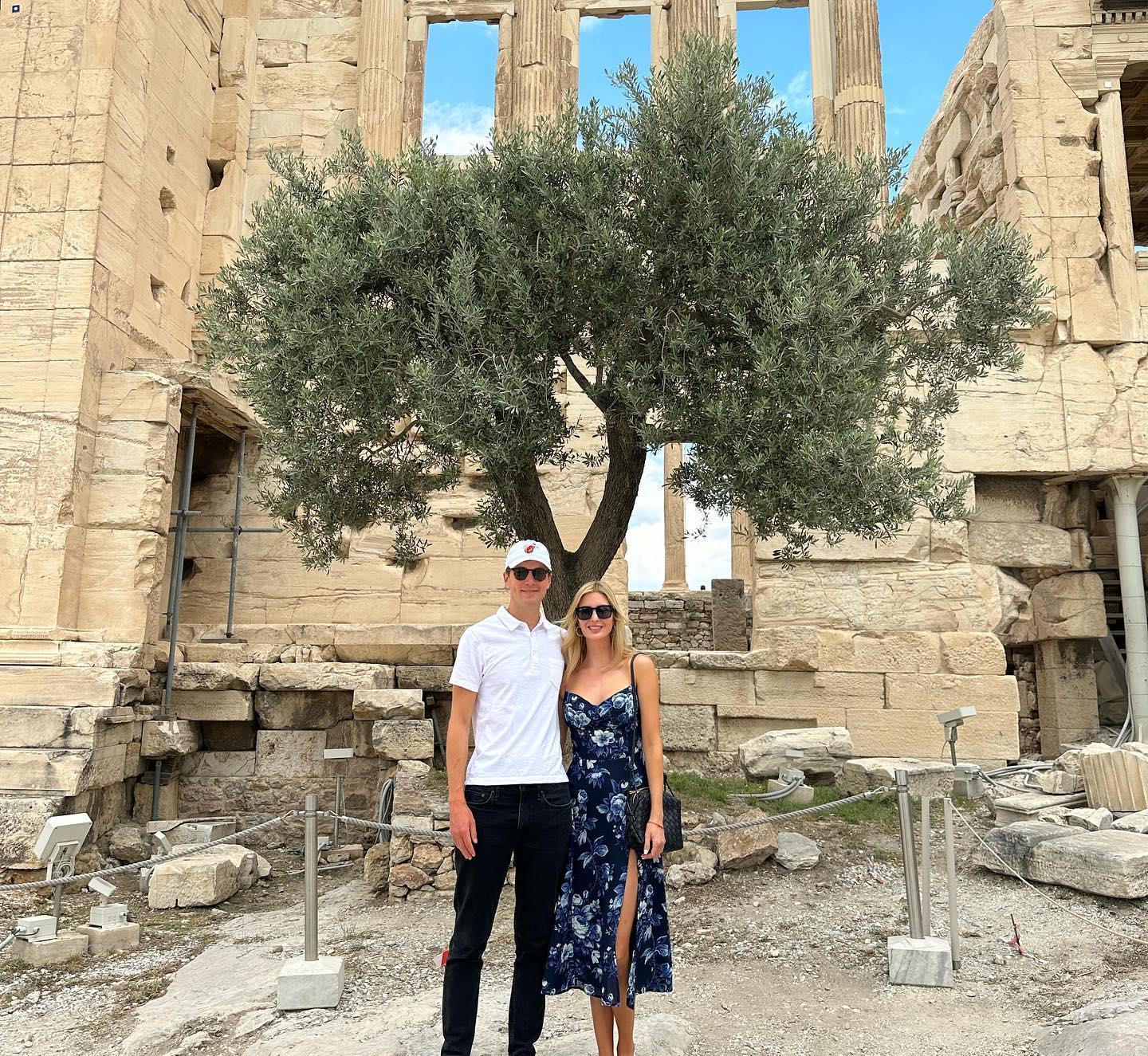 伊万卡与老公搂腰合影。这对夫妻结婚多年,但每次都超级可爱。这一次,他们抛下三个孩子,前往希腊,过上了二人世界。