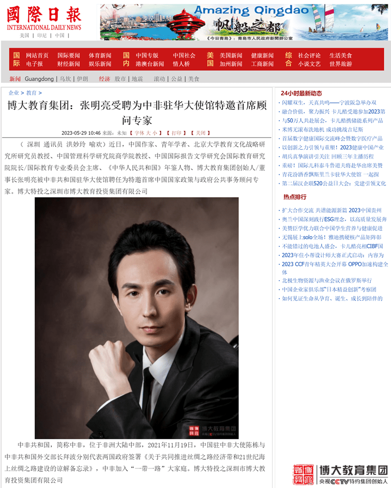 (城市中国栏目融媒体 深圳 通讯员 洪妙玲 喻欢)近日,中国作家、青年学者、北京大学教育文化战略研究所研究员教授、中国管理科学研究院商学院教授、中国国际报告文学研究会国际教育研究院院长/国际教育专业委员会主席、《中华人民共和国》年鉴人物、博大教育集团创始人/董事长张明亮被中非共和国驻华大使馆聘任为特邀首席中国国家政策与政府公共事务顾问专家。博大特投之深圳市博大教育投资集团有限公司