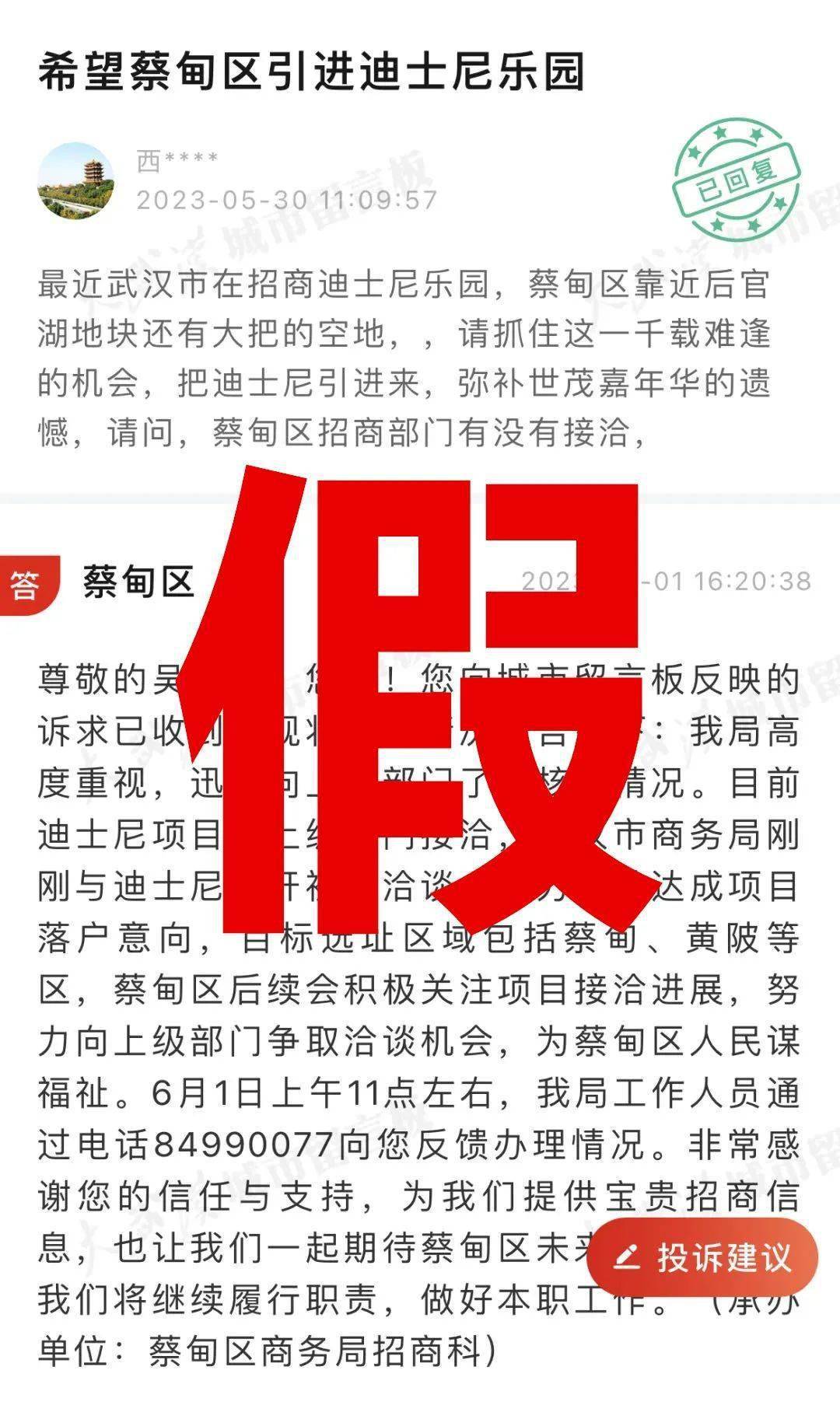 近日,有网友询问武汉市相关部门,能否引进迪士尼乐园,网传截图显示,武汉市蔡甸区回复称,市商务局刚刚与迪士尼展开初步洽谈,努力推进达成项目落户意向,后续会积极关注项目接洽进展。