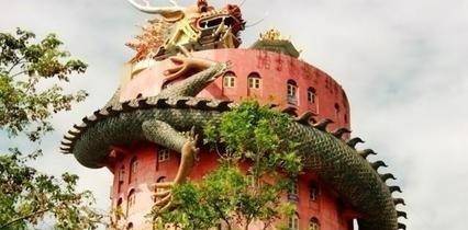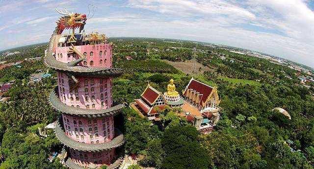 龙庙整个形状是圆柱形的,呈粉红色,在这座圆柱形建筑的周围,由上到下围绕着一条巨龙,这条巨龙栩栩如生,飞铲的巨大,在远处观看,非常的壮观,这条龙到底有多大呢?这座圆柱形的建筑高达17层。
