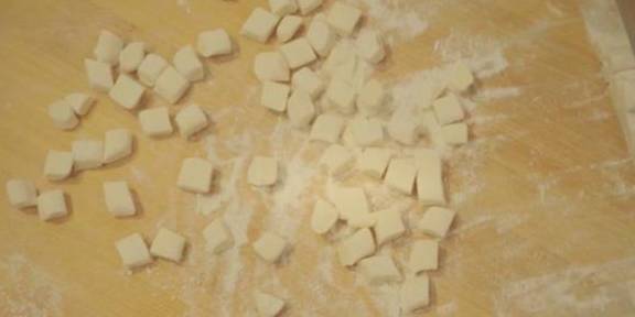 4、接下来就可以做猫耳朵了。从这个长形面棍上取约一公分左右,然后用大拇指稍摁住此小小面团往前搓,即可形成如猫耳朵形状的空心卷卷。(注意:不要太用力摁住面团,往前搓时也不可用大力,不然就粘在手指上了)
