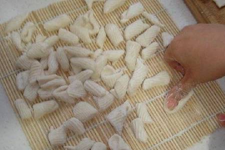 猫耳朵的制作技法十分简单。古老的方法是:把和好的面团,搓成小指粗细长条,取一截夹在左手食指与中指之间,像抽烟的样子,再用右手从面条上掐酸枣大小一块,置于左手掌心,用右手大拇指肚压住,向前轻轻一推一捻,一个猫耳朵就做成了。