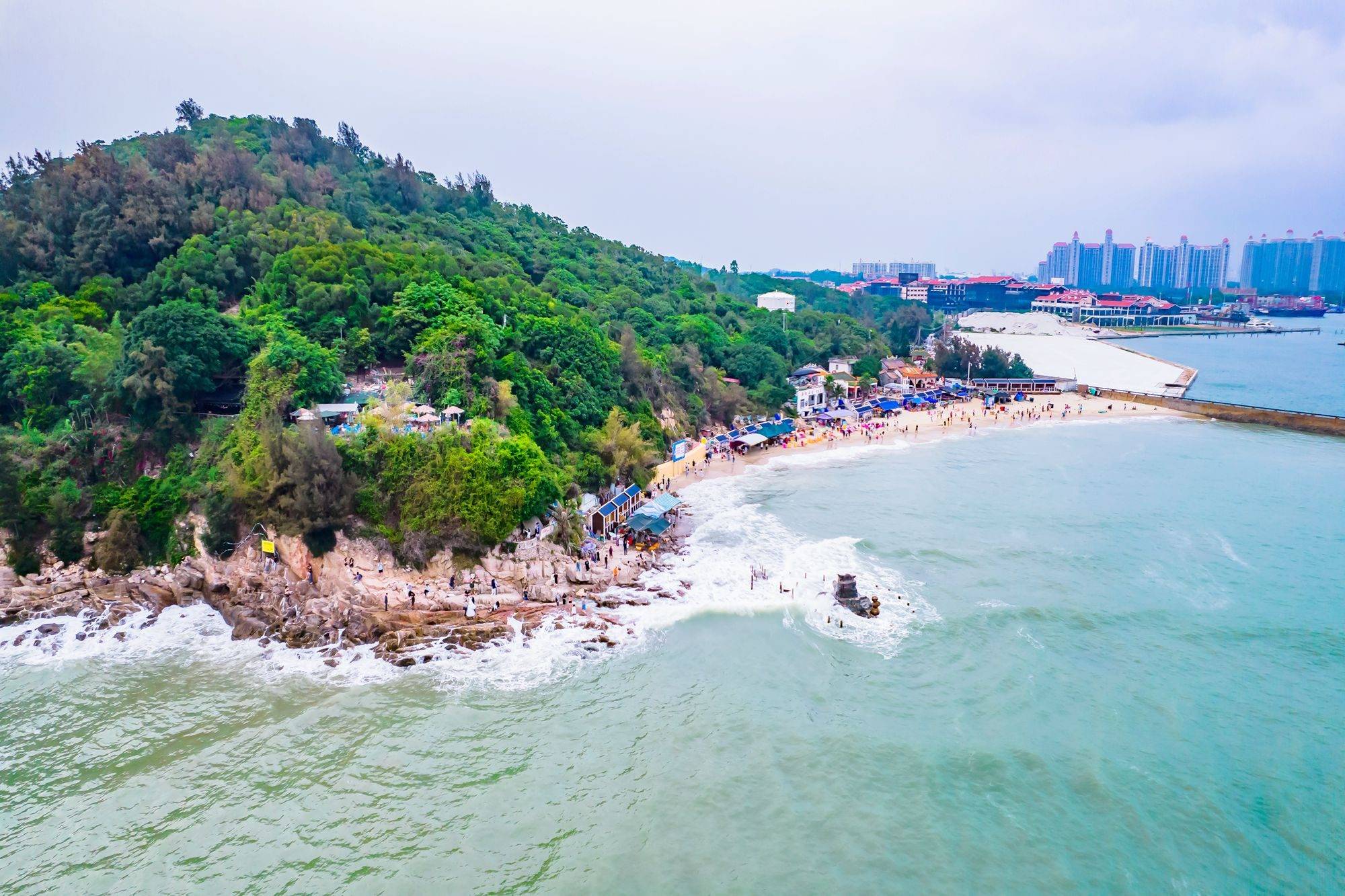 绿色的树漫山遍野,冠头岭如青龙横卧在海边,形成独特的山海风光。