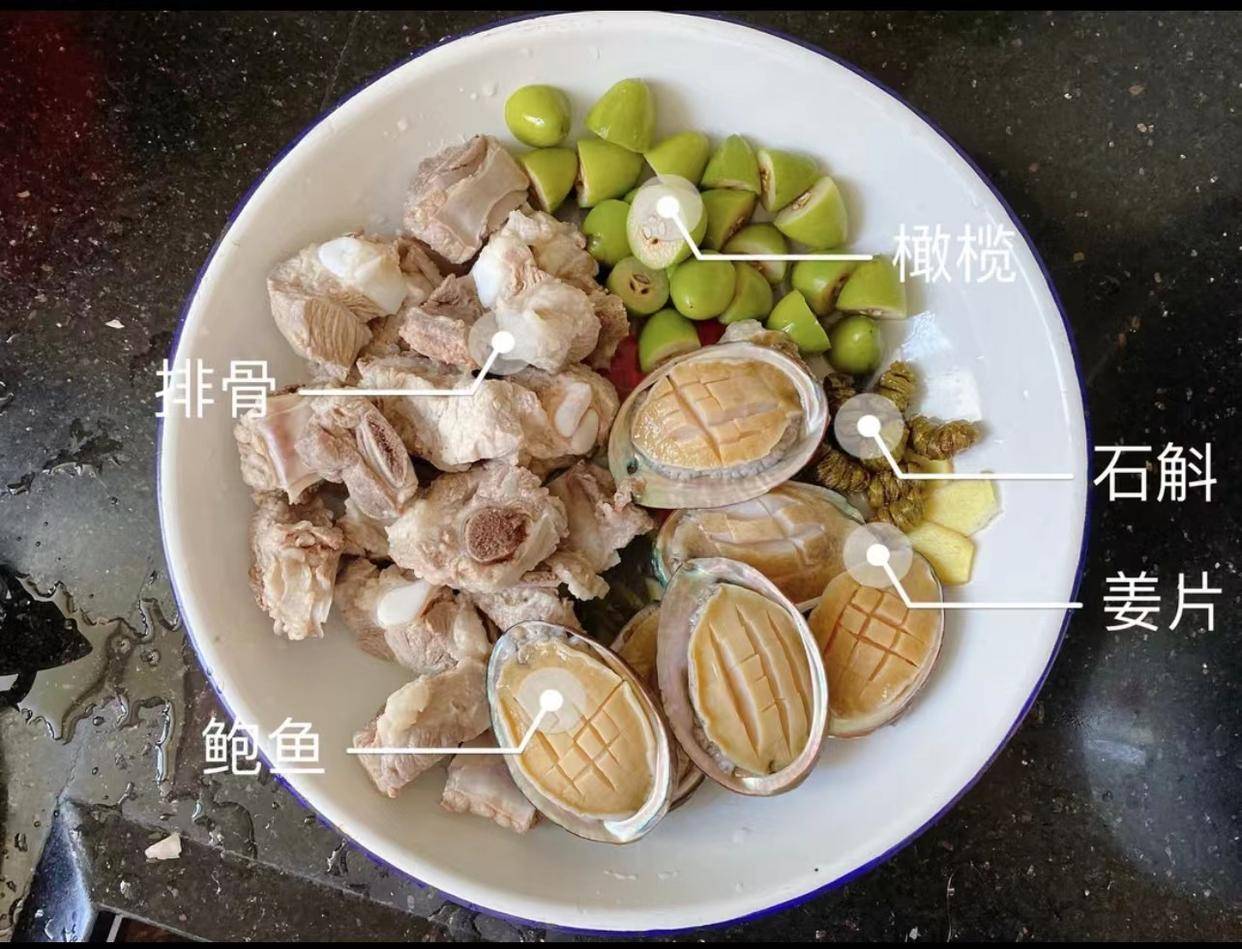 用料:橄榄10颗(不需要太多会很苦)、鲍鱼6只(按家里人头计算)、排骨、可放石斛、姜2片