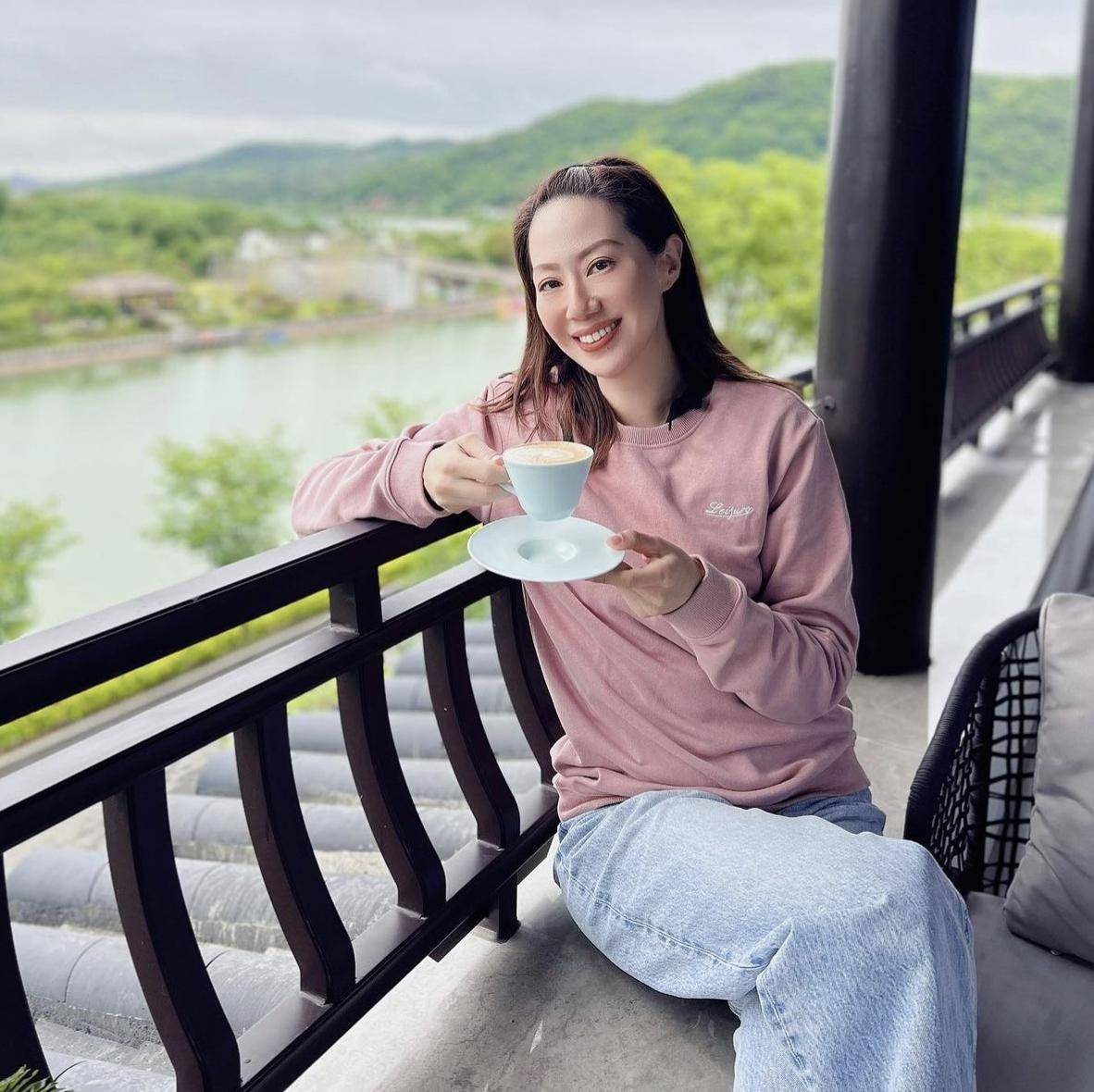 她头发的颜色是棕色的。这时候可以看到整个五官都比较立体了。她穿着一件粉色毛衣和一条牛仔阔腿裤。特别年轻,也比较减龄