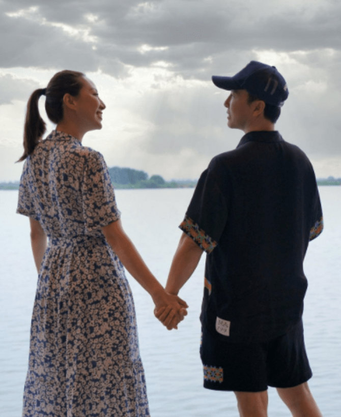 经常看到夫妻俩出去游玩,都会合影留念。可以看到他的女人戴着一顶黑色的帽子,戴着一副黑色的墨镜,穿着黑色的衣服,其实是相当的低调。