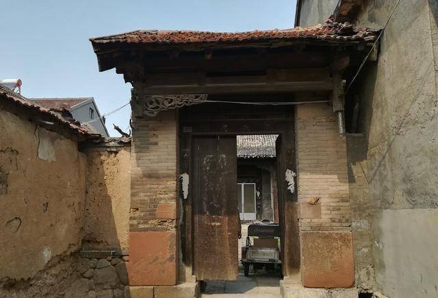 现在故居门口立上了“市级重点文物保护单位”的石碑了,挺宽大,挺气派的大门,不知道是不是广亮的大门。在门框上有四个突出来的圆形的木雕的东西,这是什么?知识点来了,这就是户对,我们常说的门当户对,那个户对就是指这个。