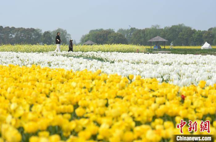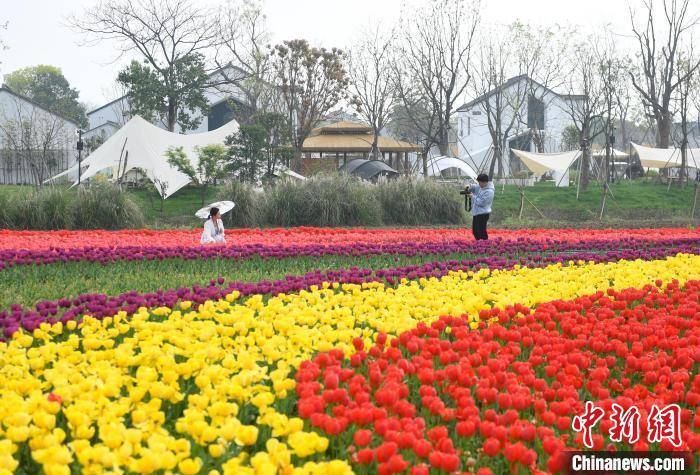 游人在潞村的郁金香花田中游览、拍照。 王刚 摄