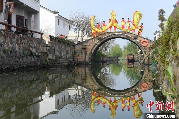 表演者在潞村古桥上表演舞龙。 王刚 摄