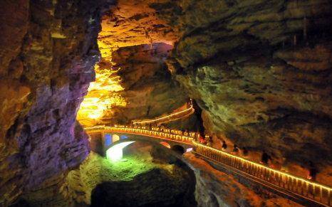 第二个,黄龙洞,黄龙洞位于湖南省张家界武陵源区索溪峪镇河口村黄龙洞景区,这里作为世界的自然遗产,世界地质公园张家界的有机组成部分,地处核心景区,属于典型的卡斯特岩溶地貌,张家界旅游的精品线之一,享有“绝世奇观”的美誉。黄龙洞有着庞大的立体结构洞穴空间,丰富的溶洞景观使人流连忘返,还有水陆兼具的游览观光线路独步天下。黄龙洞现在已经开放的龙舞厅、响水河、天仙水、天柱街、龙宫、迷宫、花果山等游览区,各个景点紧密相连,各有特色,洞中有洞,洞中有河,由石灰石质溶液凝结而成的石钟乳、石笋、石柱、石花、石幔、石枝、石管、石珍珠、石珊瑚等各种洞穴遍布其中,琳琅满目,无奇不有。