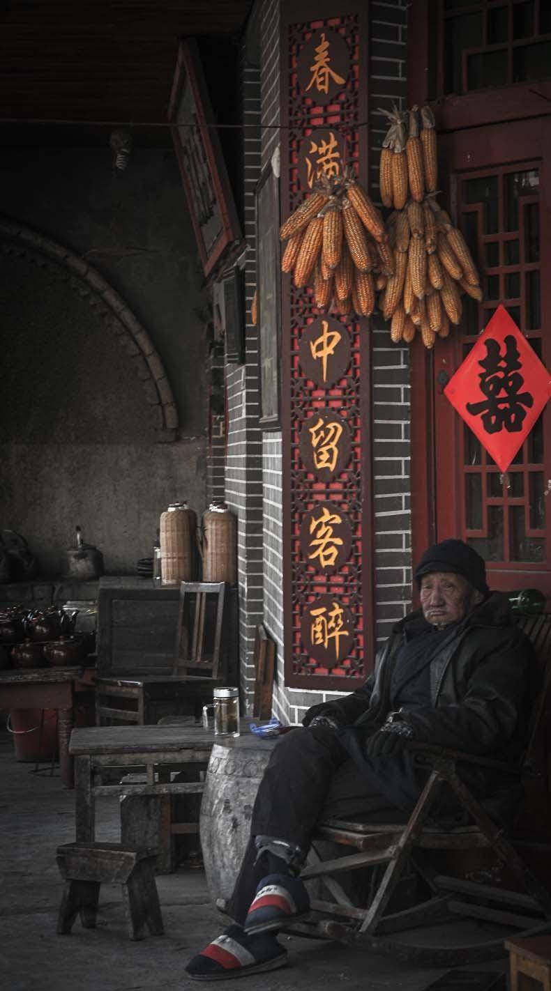 一方水土养一方人,安徽淮北濉溪县临涣古镇茶馆并一直延续至今。图为皖北临涣古镇上居住的一位老人,坐在家门口的木椅上休闲度日。