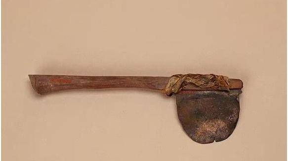 最后一件物品是一个怪器,它的上部有一个带绳索的手柄,下部是一个铜片,手柄和绳索就是为了保证人们能够在用它的过程中,能够更加的牢固,而那个铜片难道是一种工具?