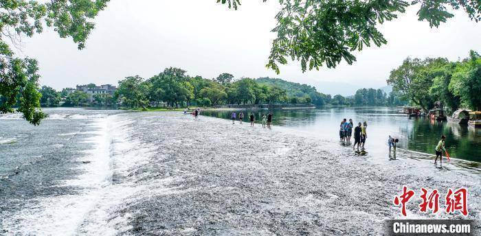 图为民众在灵渠“人”字形水坝上玩耍。 蒋丰慧 摄