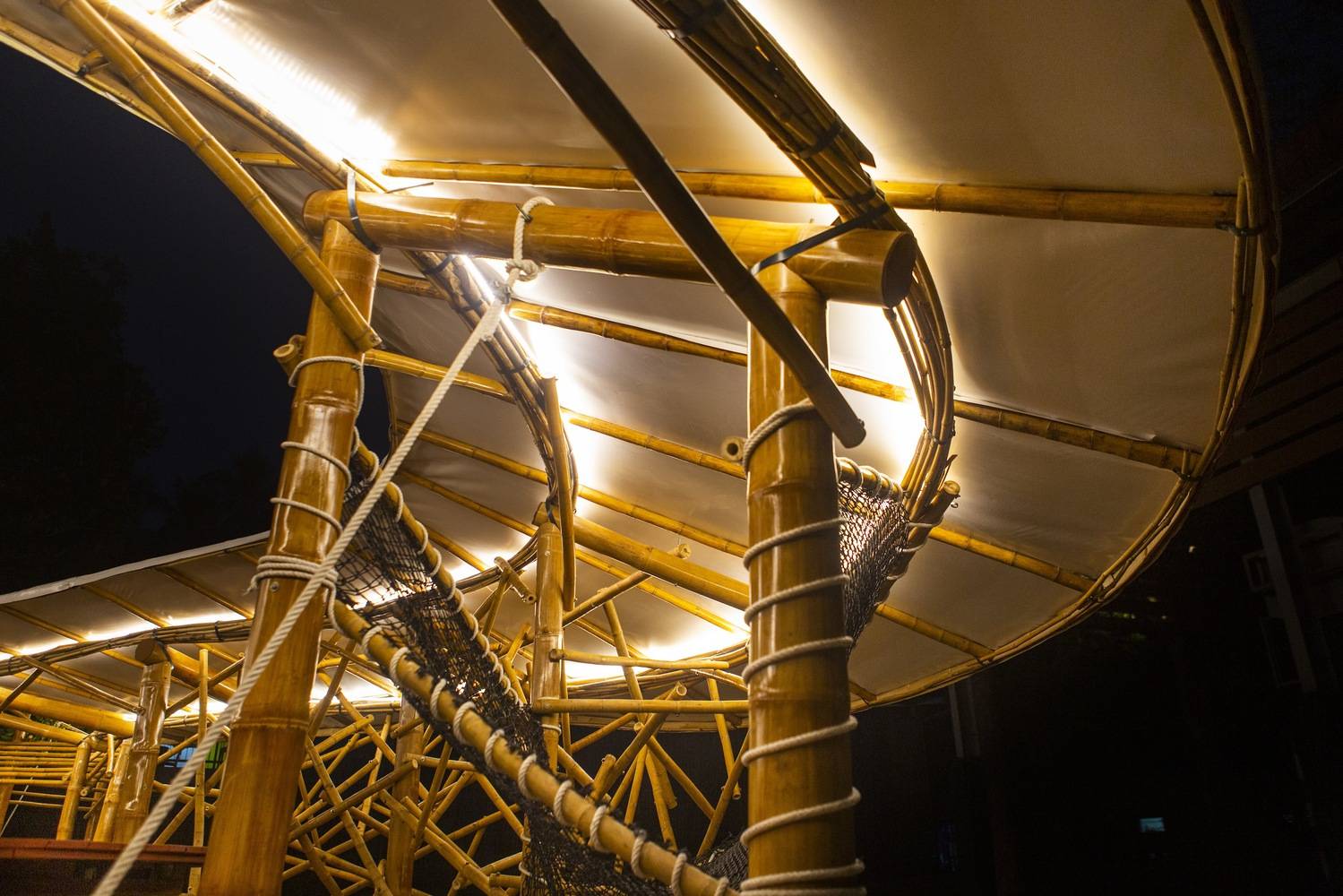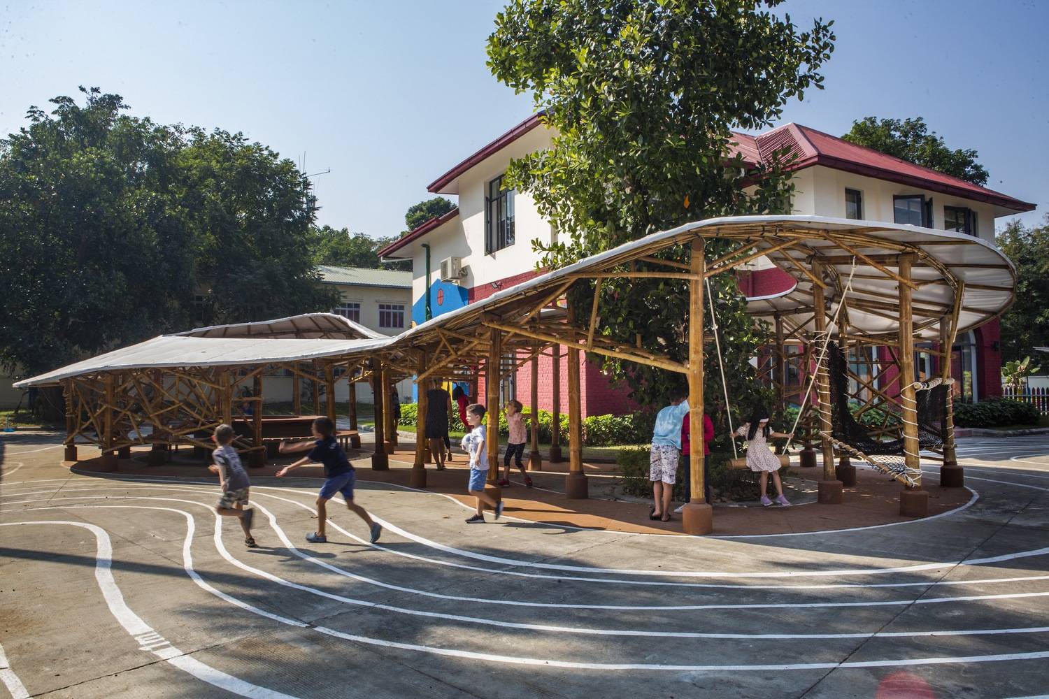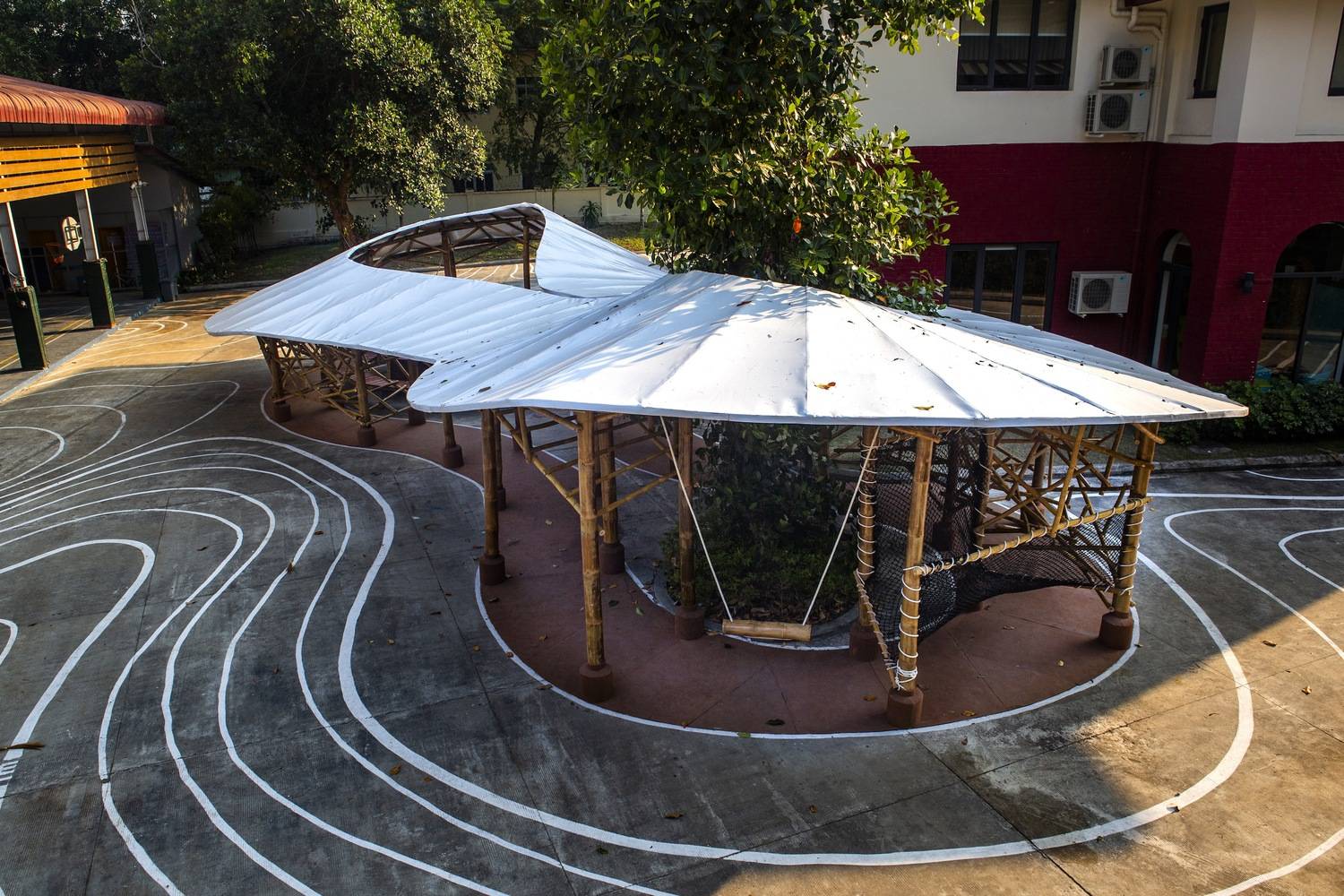 整个结构由三种不同品种的竹子制成,龙竹用于框架,锐药竹用于弧形元素,而支撑和屋顶梁则采用泰竹。在∞形状的两个开口内是场地的既有树木和座位空间,供教师休息的同时能够随时视察孩子们的情况。