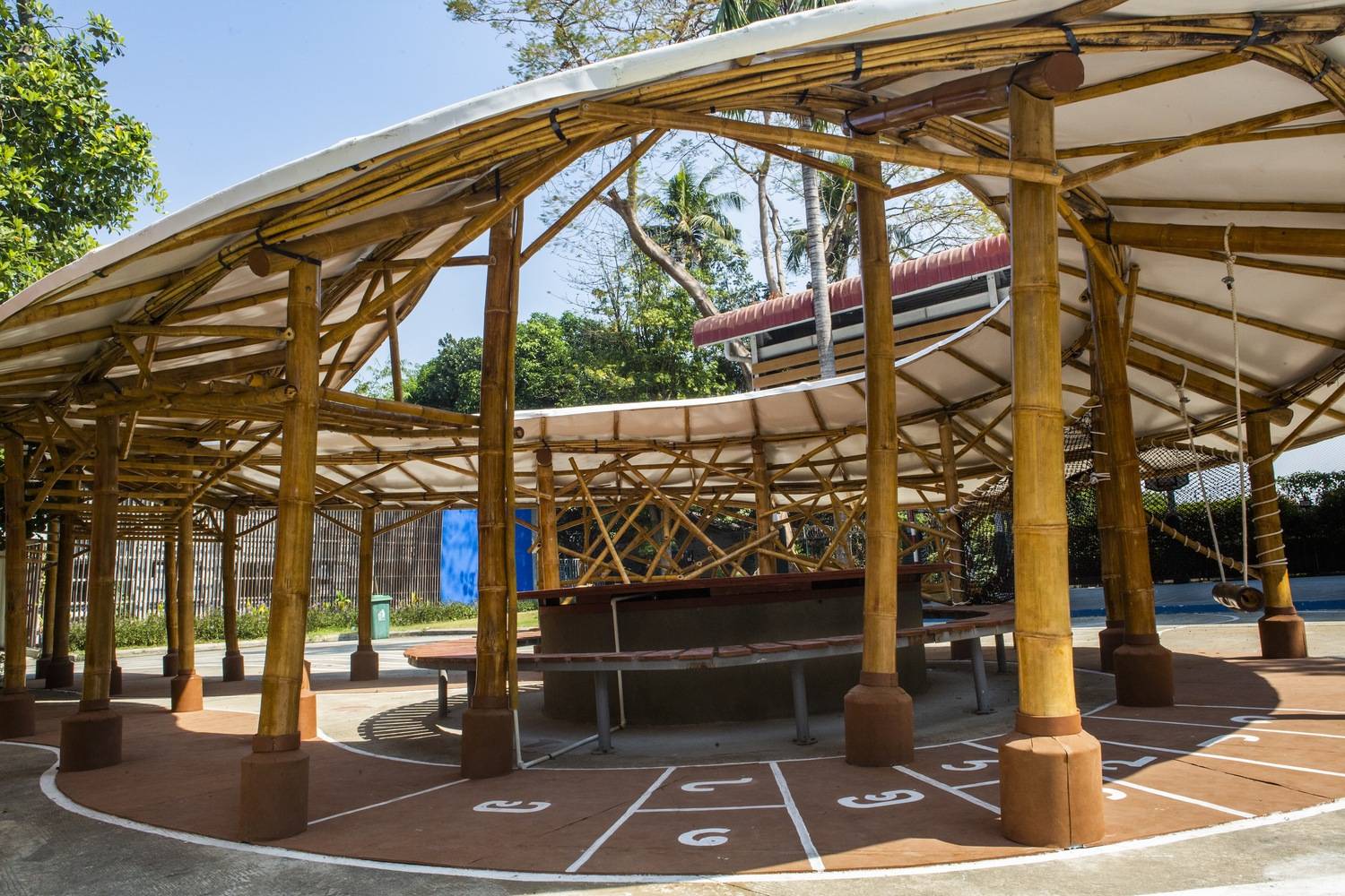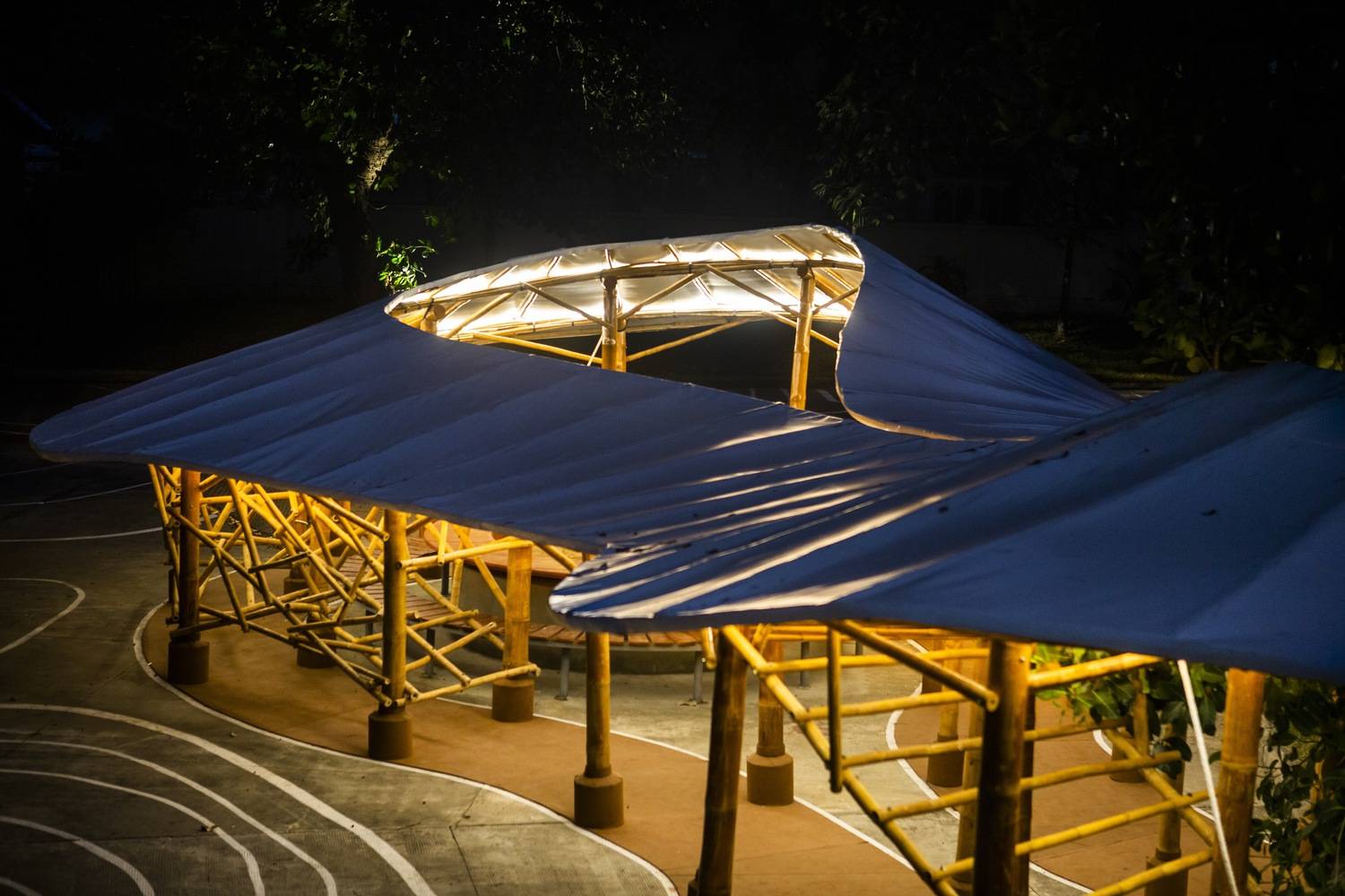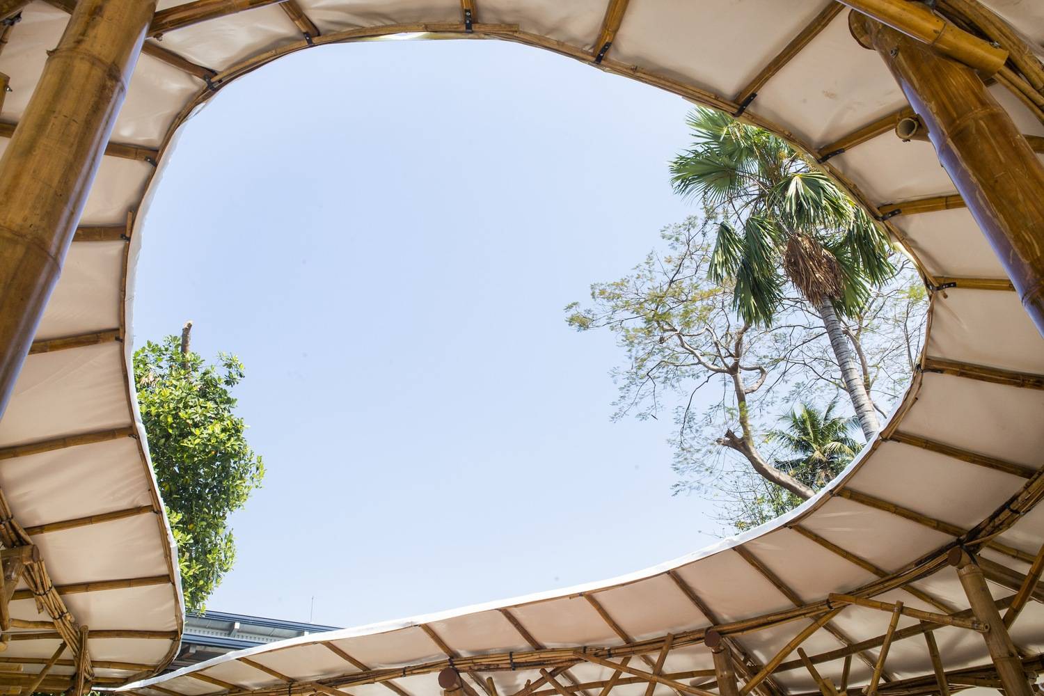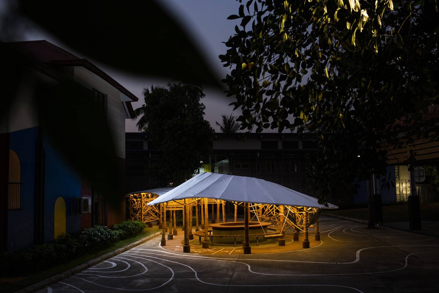 整个结构由三种不同品种的竹子制成,龙竹用于框架,锐药竹用于弧形元素,而支撑和屋顶梁则采用泰竹。在∞形状的两个开口内是场地的既有树木和座位空间,供教师休息的同时能够随时视察孩子们的情况。