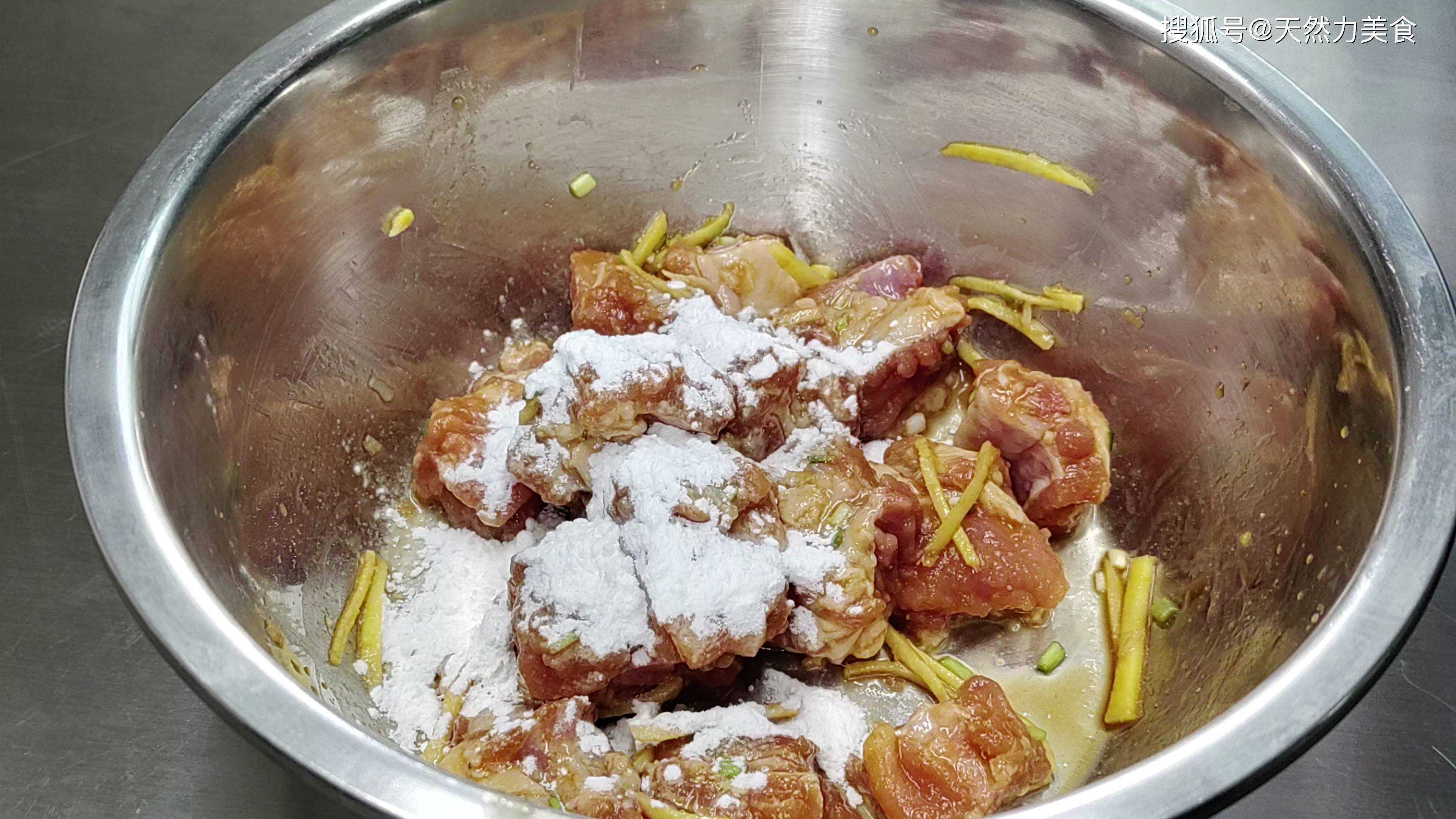10、充分搅拌均匀后把干淀粉倒进去搅拌均匀,让排骨的外表都能过上一层薄薄的淀粉,加淀粉可以锁住排骨中的水分,同时也可以起到让排骨更嫩滑的作用。