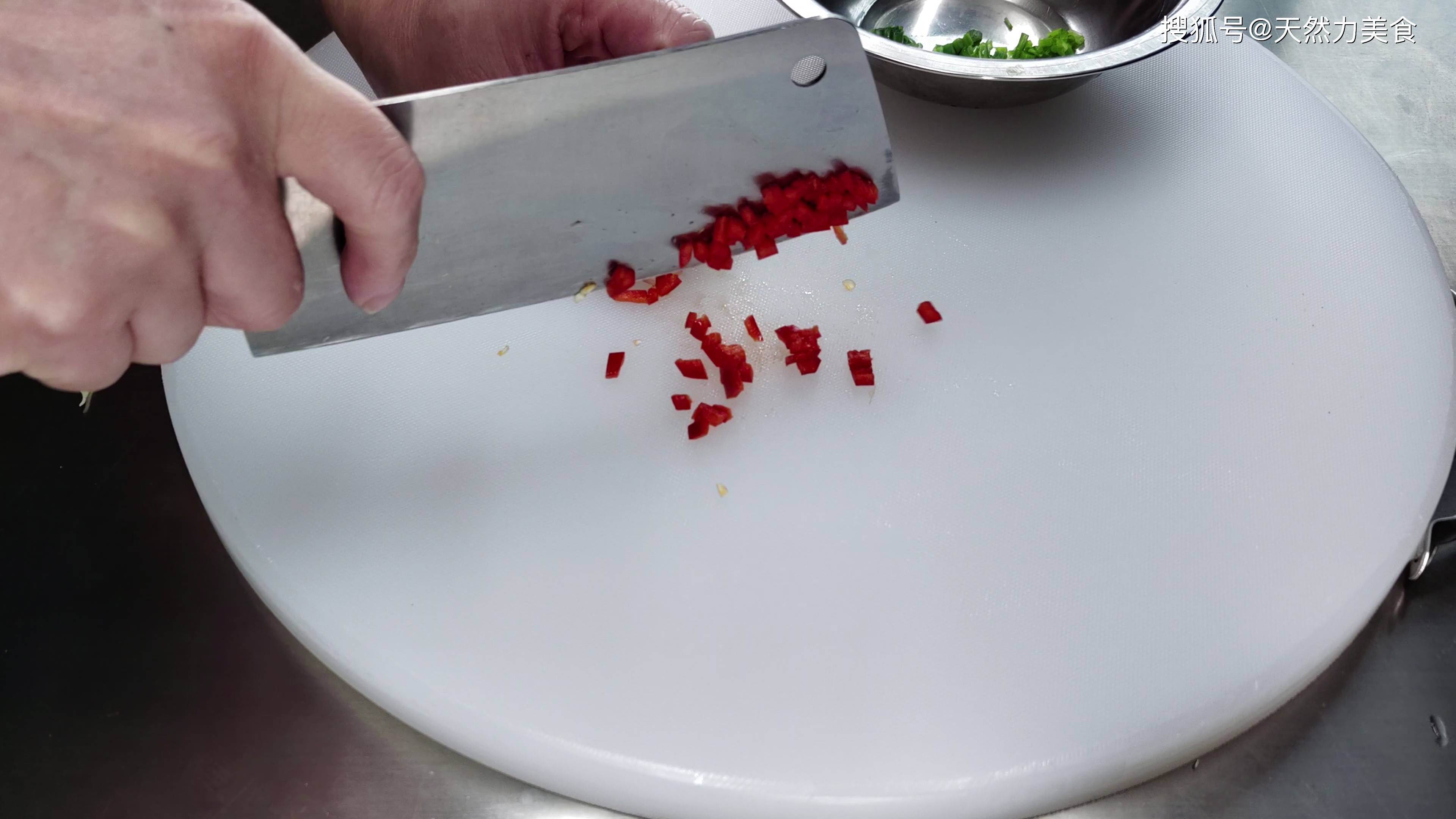 5、红辣椒是用来点缀配色用的,所以可有可无都无所谓。要用到的红辣椒不需要太多,把红辣椒切成小丁即可。