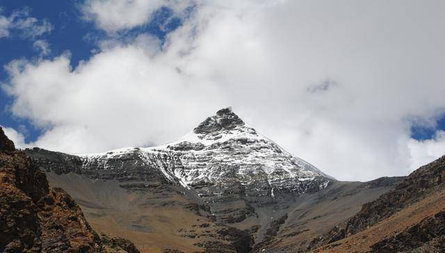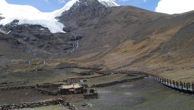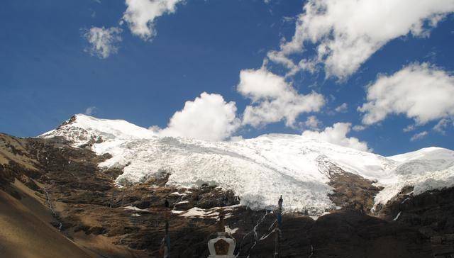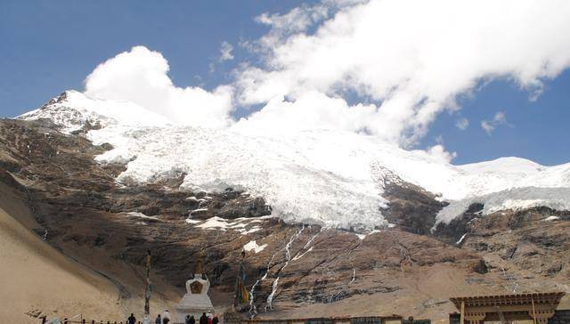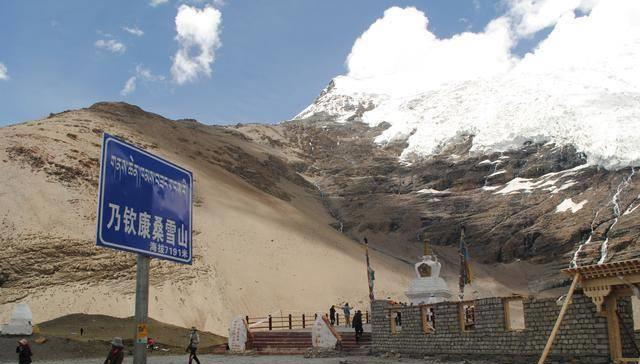乃钦康桑雪山是西藏四大神山之一,位于西藏浪卡子县和江孜县交界处317省道旁,海拨7191米。由于高寒山体顶部尖锥突兀,冰雪终年累积、压实,便形成了厚达20—100米的冰层,冰层受本身重力影响,缓慢移动发育成了多条冰川。卡若拉冰川就在乃钦康桑雪山下,雪白的冰川如一副巨型唐卡挂在山壁上,在阳光的照耀下熠熠生辉。