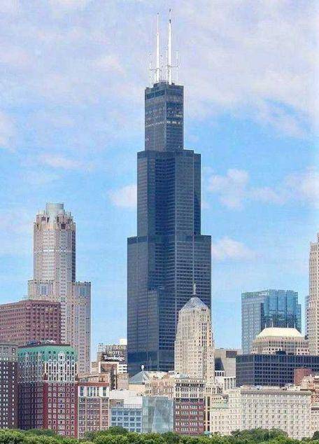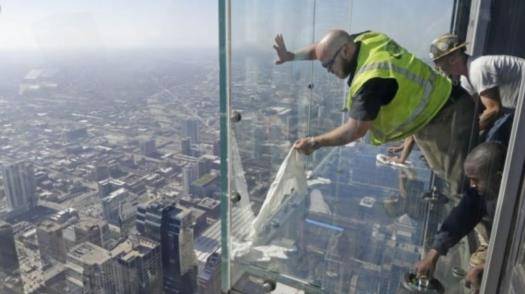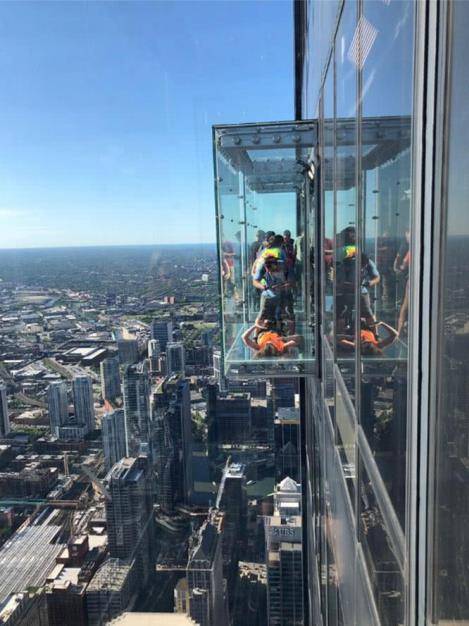 这栋摩天大楼就是美国芝加哥的威尔斯大厦,这栋大厦有110层楼,在103层的地方,设立了一个观景台,就像一个空中阳台一样,地下是玻璃的。
