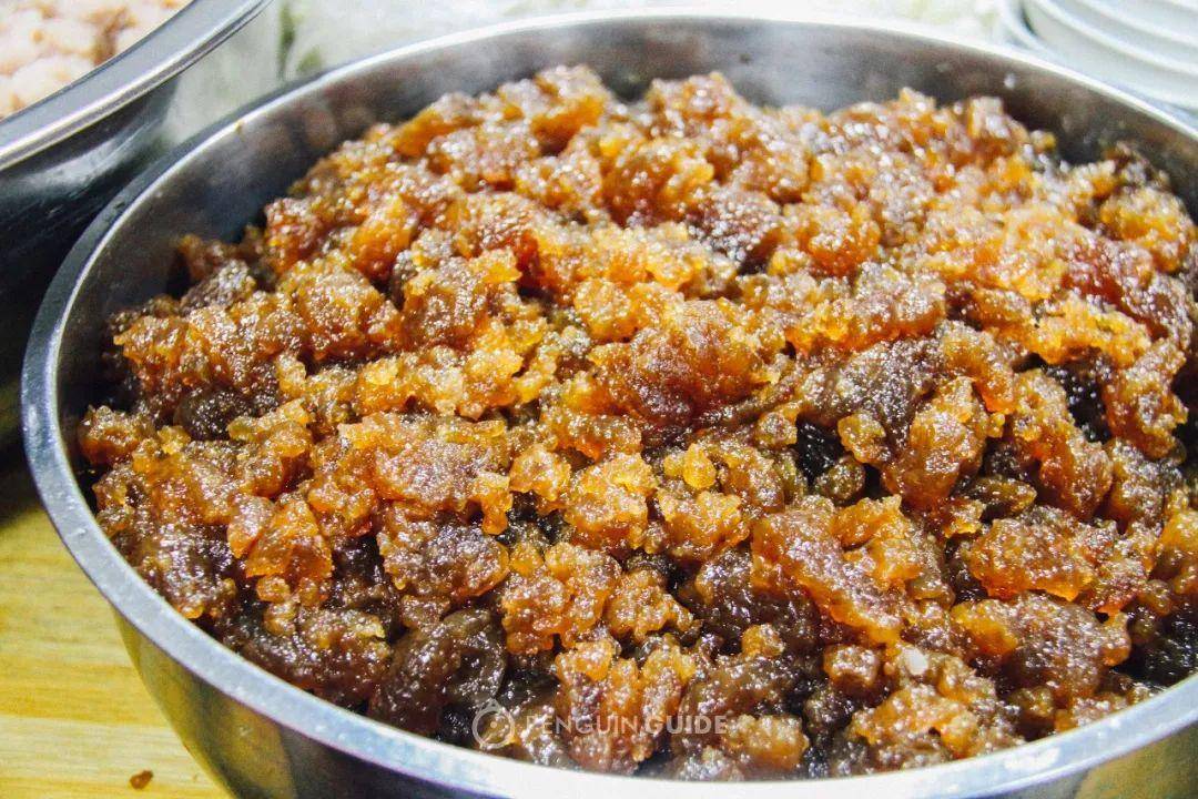 嘫嘫和呱呱一“锅”同生,是制作呱呱时最上面的那层精华。在天水,也有的嘫嘫是用土豆淀粉制成。嘫嘫和吃法大体上也差不多,只是调味偏酸辣,口感更软绵一点。