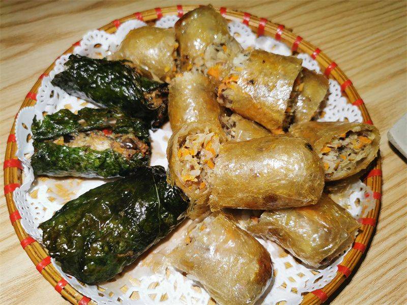 酥脆可口的春卷,内里是粉丝、白菜、木耳、胡萝卜等小菜做的馅,裹上酸辣可口的蘸水,一口一个根本停不下来!