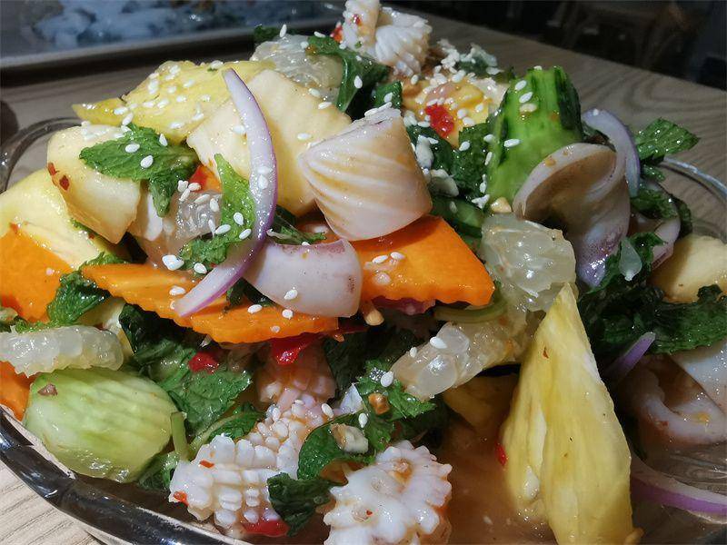 鱿鱼黄瓜是一道河口的特色小吃,放入薄荷、小米辣、姜蒜等调料一起凉拌,除了黄瓜和鱿鱼,还可以放入柚子、芒果、菠萝、苹果等水果,酸、甜、辣等味道融合得十分巧妙,不仅有水果和黄瓜的清香,还有鱿鱼的鲜甜,让人尝过就难以忘怀。