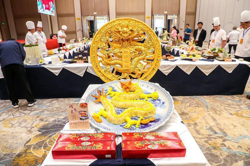 作品展示区,一道造型独特的“蟠龙菜”引得众人围观品鉴。大瓷盘中,只见一条周身金黄、神态威武的“龙”盘成圆形,片片“龙鳞”整齐排列,甚是夺目。
