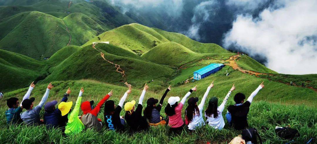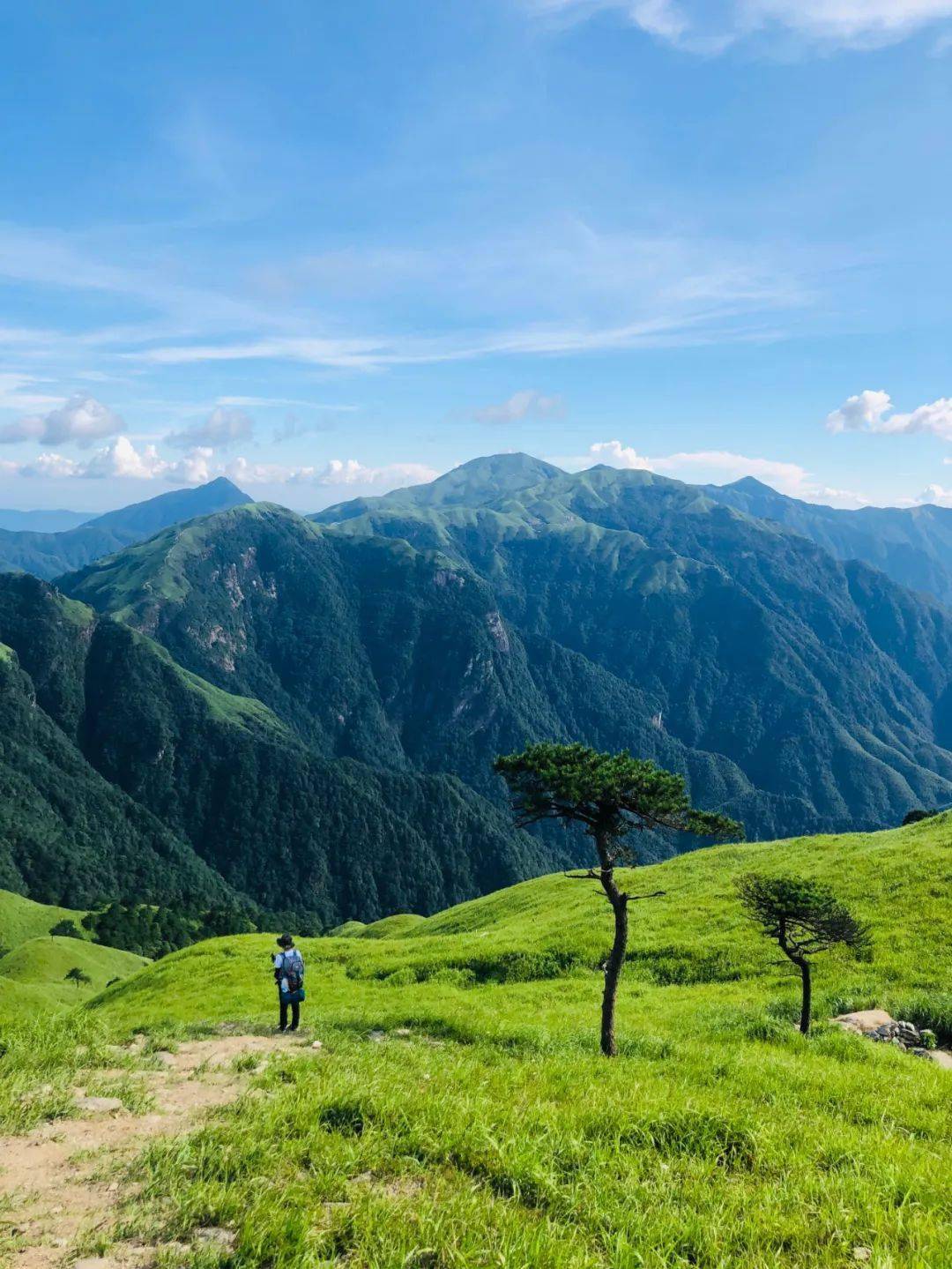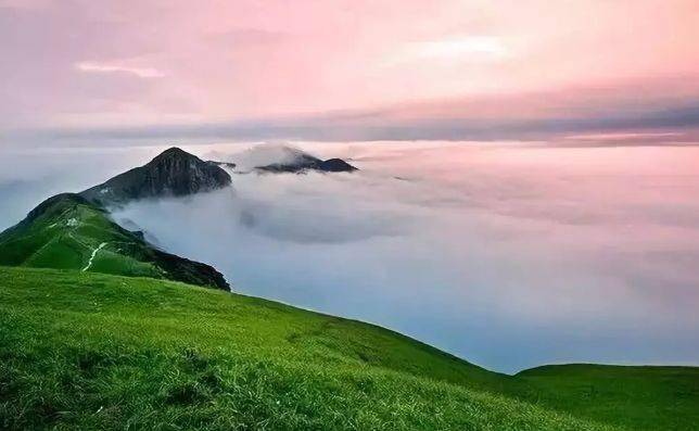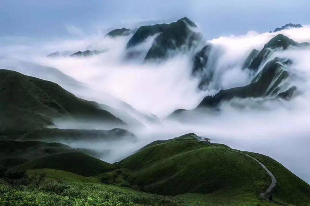 武功山拥有国内少见的高山草甸,登上草甸高处望去,满山绿色随着一个个起伏平缓的山丘,向四周山峰间隙的天际延伸,伴随着蓝天白云,就像是一幅画卷。