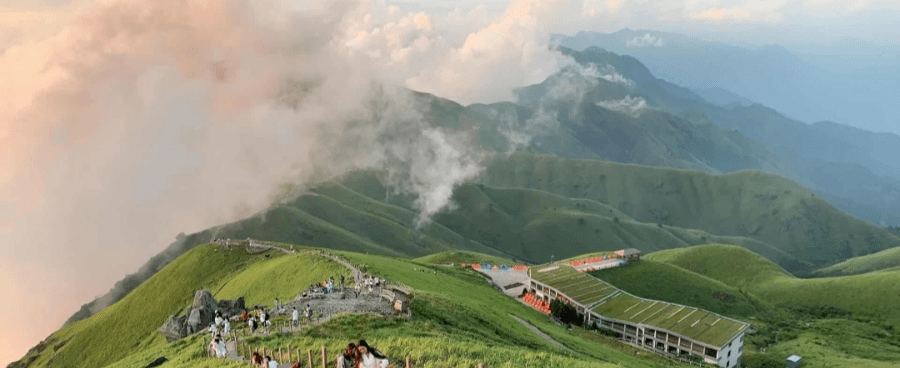 06:50火车到达了萍乡,此时大巴车已在出站口等待,1小时左右的车程,大巴送到武功山景区大门口,乘坐一级缆车【自费65元】,上山。下缆车后继续登山,2小时左右到达金顶。想轻松点的可以走半小时继续【自费35元】乘坐二级索道,二级索道下缆车后只要30分钟就能到金顶。