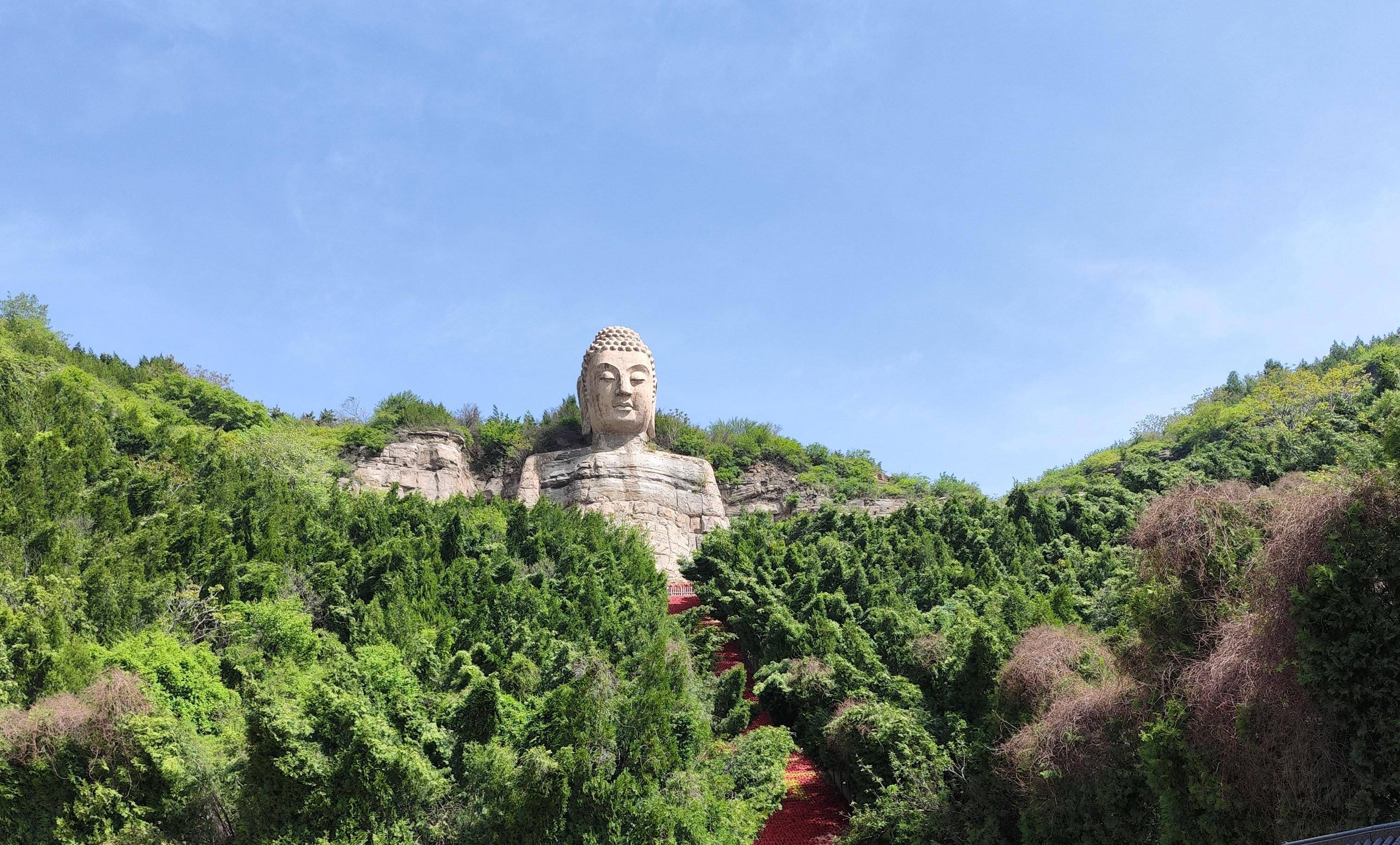 站在塔林的高处,透过茂密的树林,已经可以看到大佛的雄姿了,不禁让人加快了脚步。前几天太原刚下了一场雨,下面的山谷之中,溪流淙淙,在春风的吹拂下,山中古木早已萌发嫩叶,满眼翠绿,一派生机。溯溪而上,大佛也时隐时现,跨过小溪,很快就看到了礼佛的登山台阶,沿着台阶向上攀登,不一会儿,这尊神秘的大佛就矗立在眼前了。