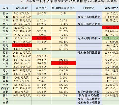 据不完全数据显示,目前已有23个省市发布了今年“劳动节”期间的假期出行成绩。浙江是全国最大的游玩胜地,“劳动节”长假期间,全国共招待旅客3125万人,完成了369.7亿元的游玩收入,比去年的现在增进了71%,比去年增进了122.6%,比2019年增进了6.5%,比去年增加了3.8%,比今年增进了3.8%。