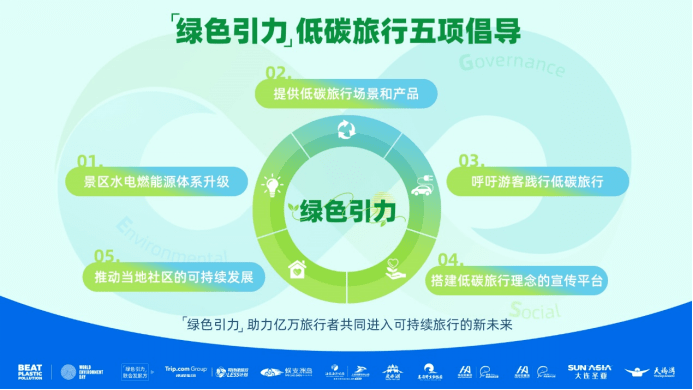 6月5日世界环境日期间,携程集团联合9家景区宣布共同发起“绿色引力”低碳旅行项目,旨在通过在景区场景提供低碳的旅行产品,号召游客共同加入可持续旅行,从减碳、减塑等多个层面参与行动,以响应由联合国环境署发起的“塑战塑决”全球低碳行动号召。