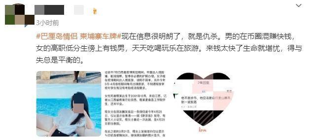 程某和男友去巴厘岛旅游,双双死在酒店当中,这件事引起了很多人的关注,很快就有人扒出了他们两个人的照片,还出现了“仇富”的声音。