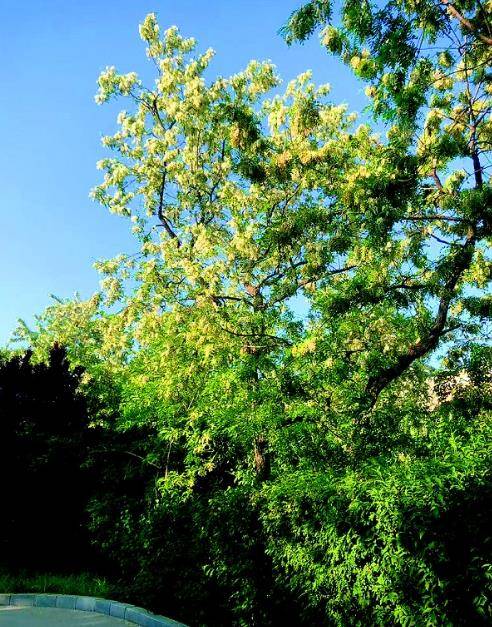 赏槐打卡地位于半山漫道体育主题公园,从海水淡化厂后山道路至塔山社区电视插转台区域道路。